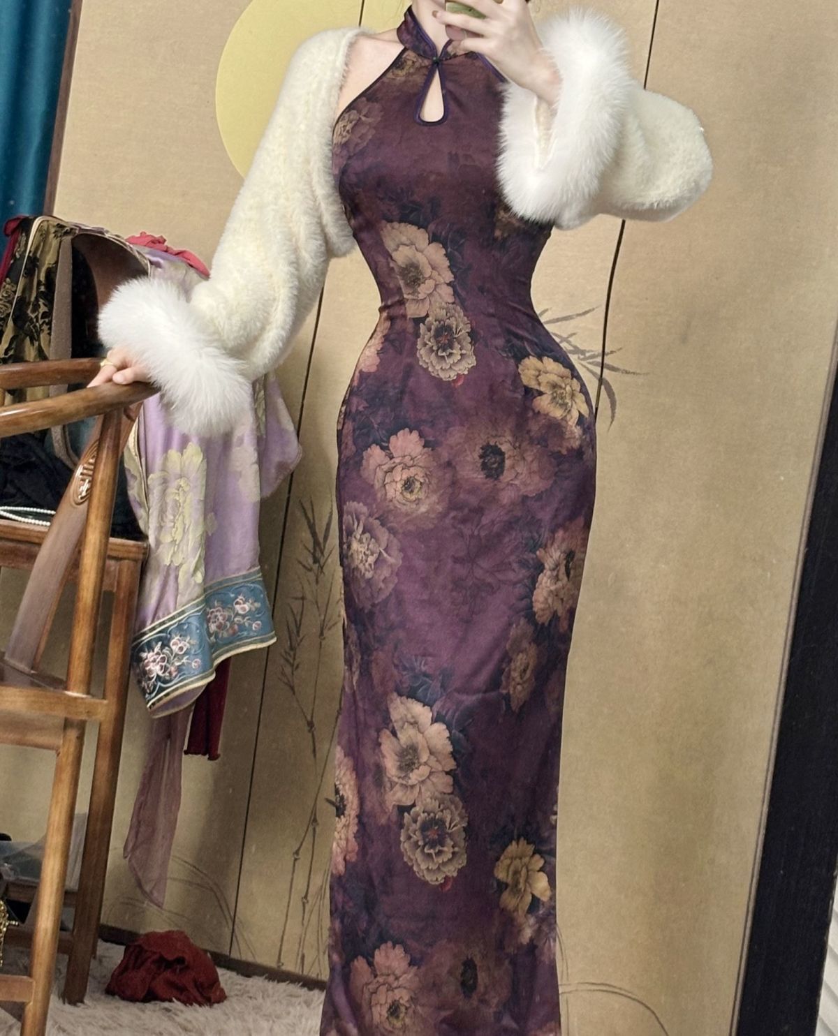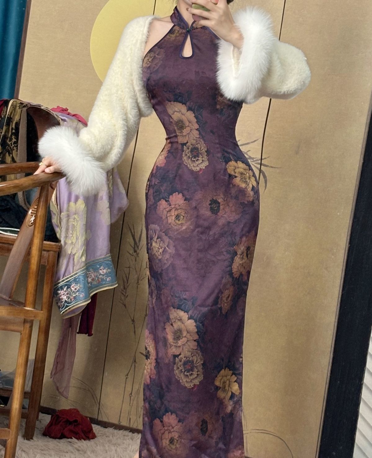 オリジナル自作春モデル新中国風風情水滴襟箔押し花超仙旗衿紫妃ワンピース