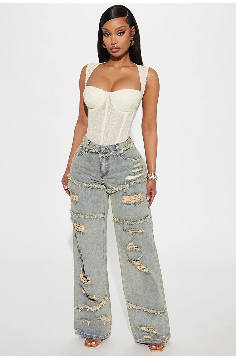 浅蓝色破洞蕾丝牛仔阔腿裤女2025新款韩版时尚高腰显瘦宽松休闲裤