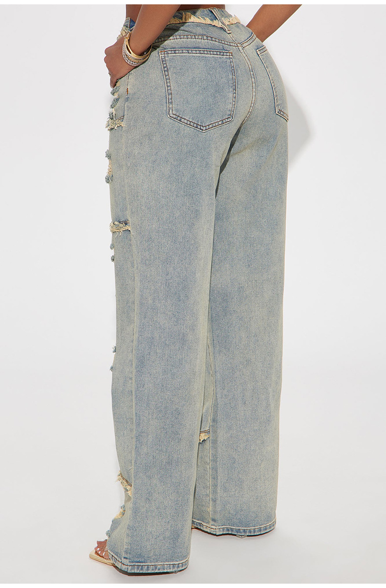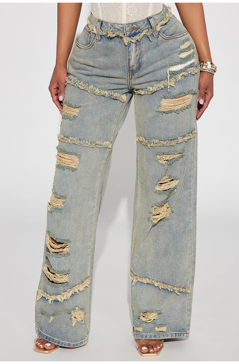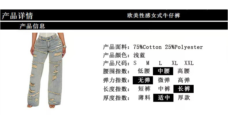 欧美跨境外贸破洞牛仔裤洗水高腰直筒百搭宽松牛仔长裤女 JEANS