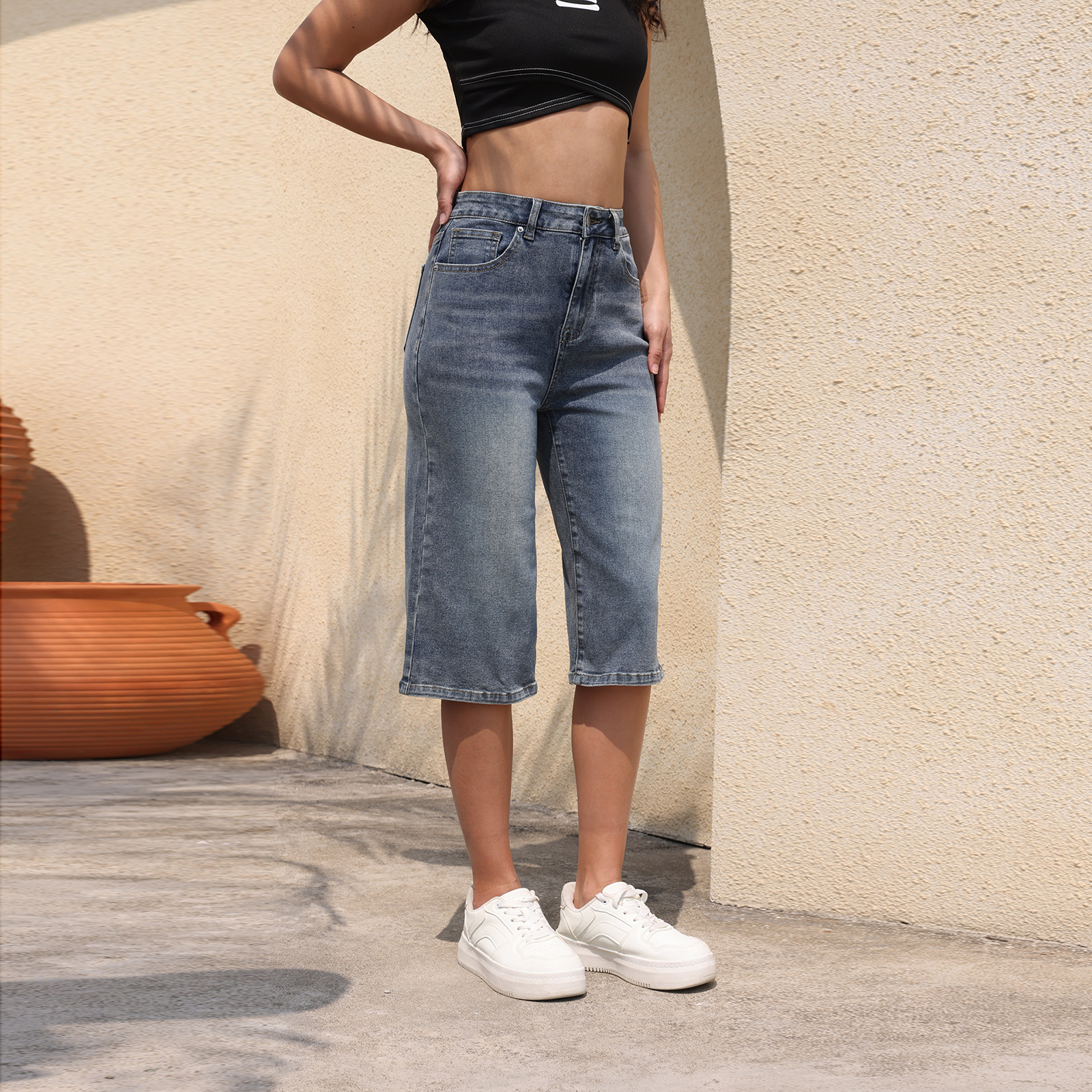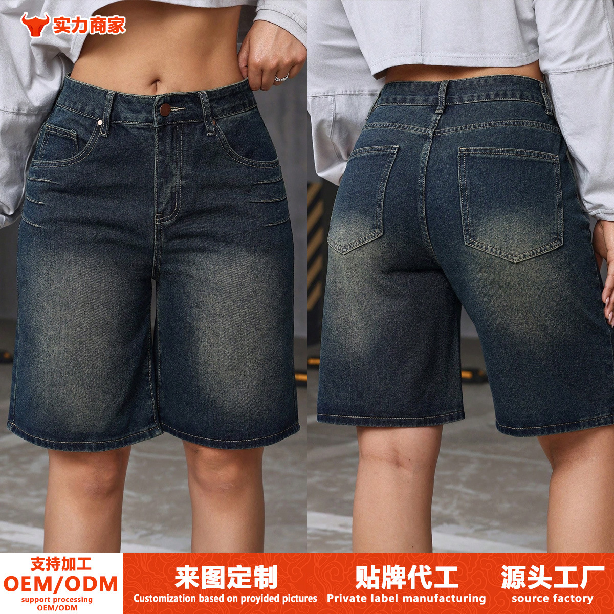 越境貿易アマゾン欧米原産工場製レトロウォッシュデニムショートパンツレディースブルートレンドゆったりミドル丈パンツ