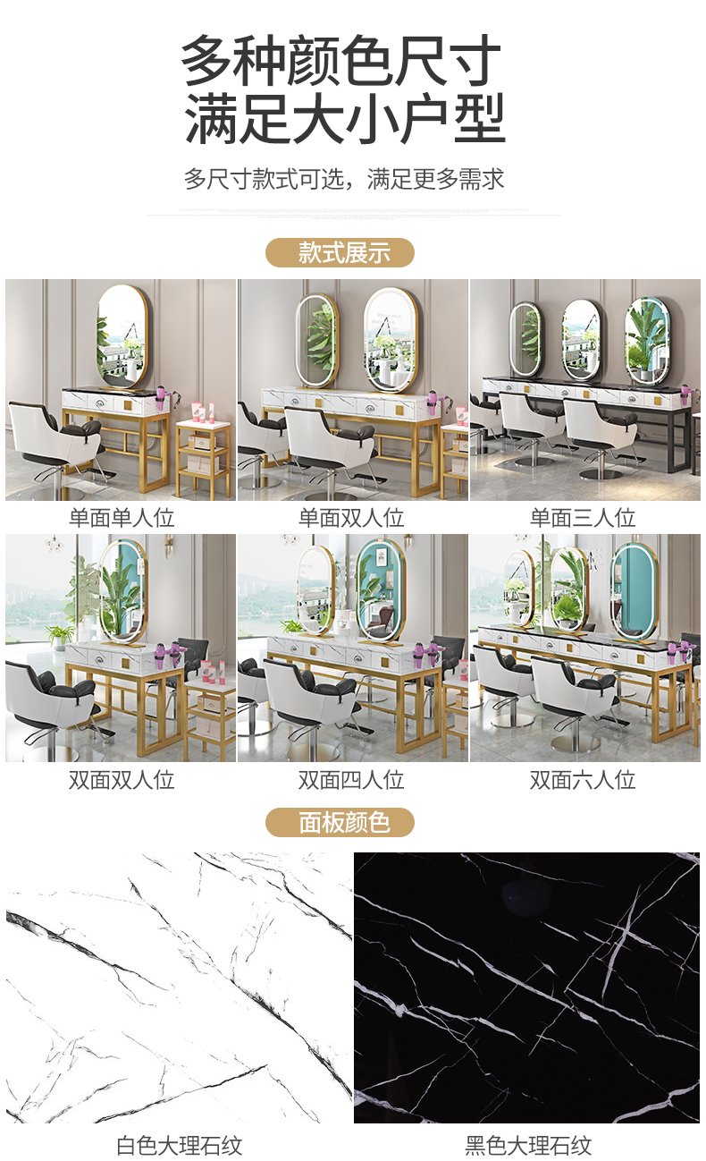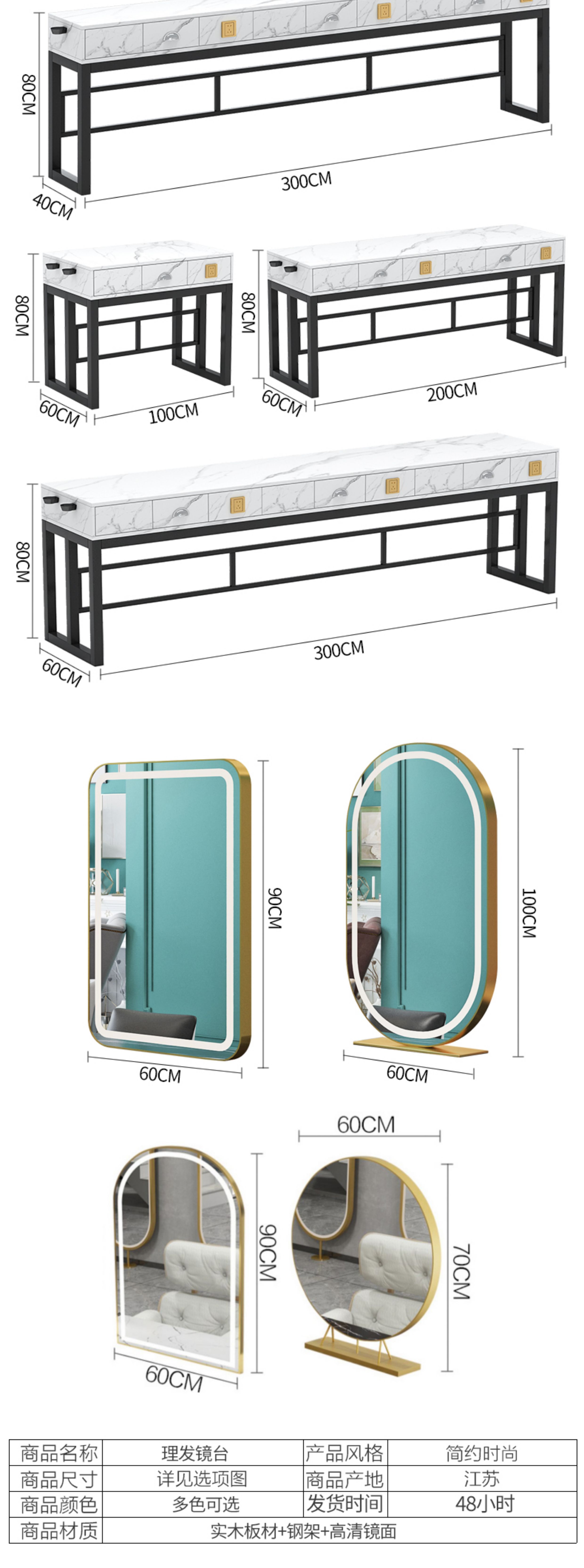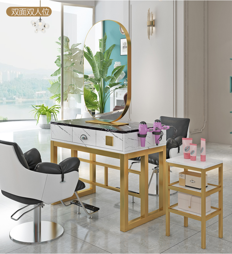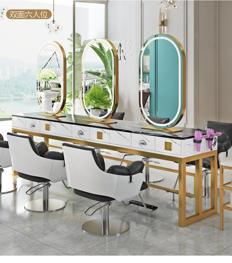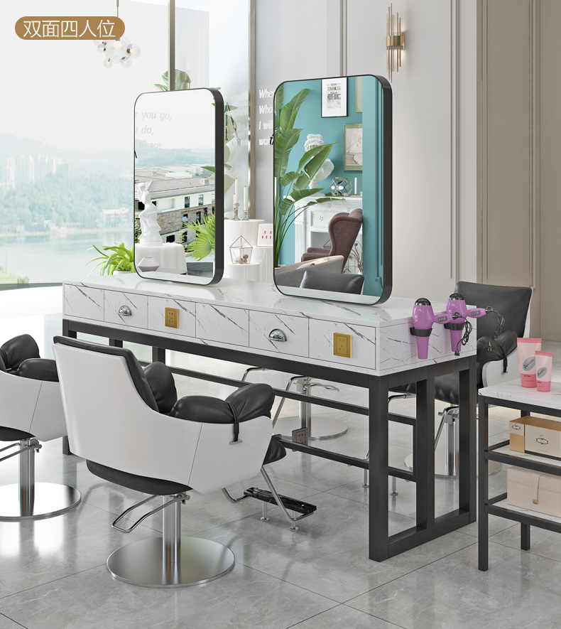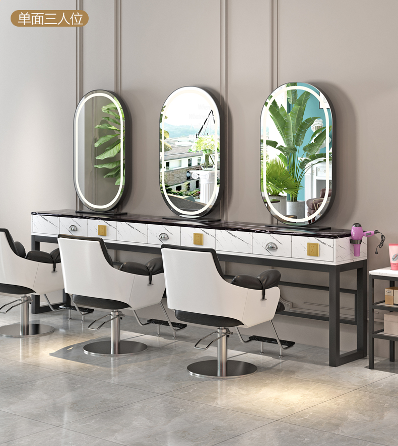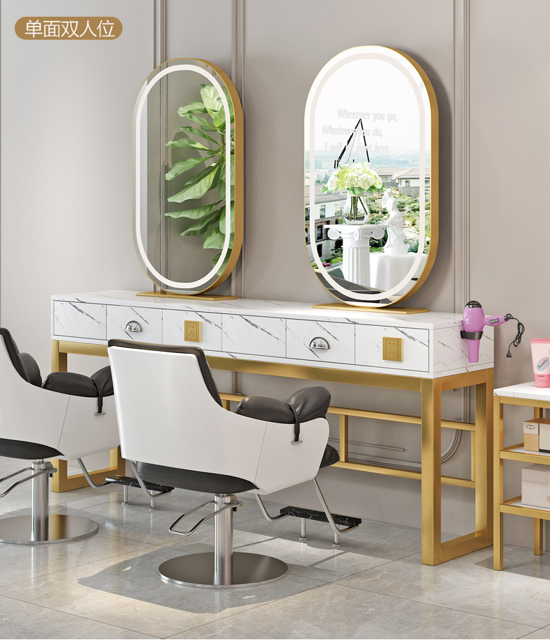 新しい理髪ミラーテーブル、美容室、片面ヘアカットミラーキャビネット、一体型ヘアサロン大理石、ライト付き両面パーマ