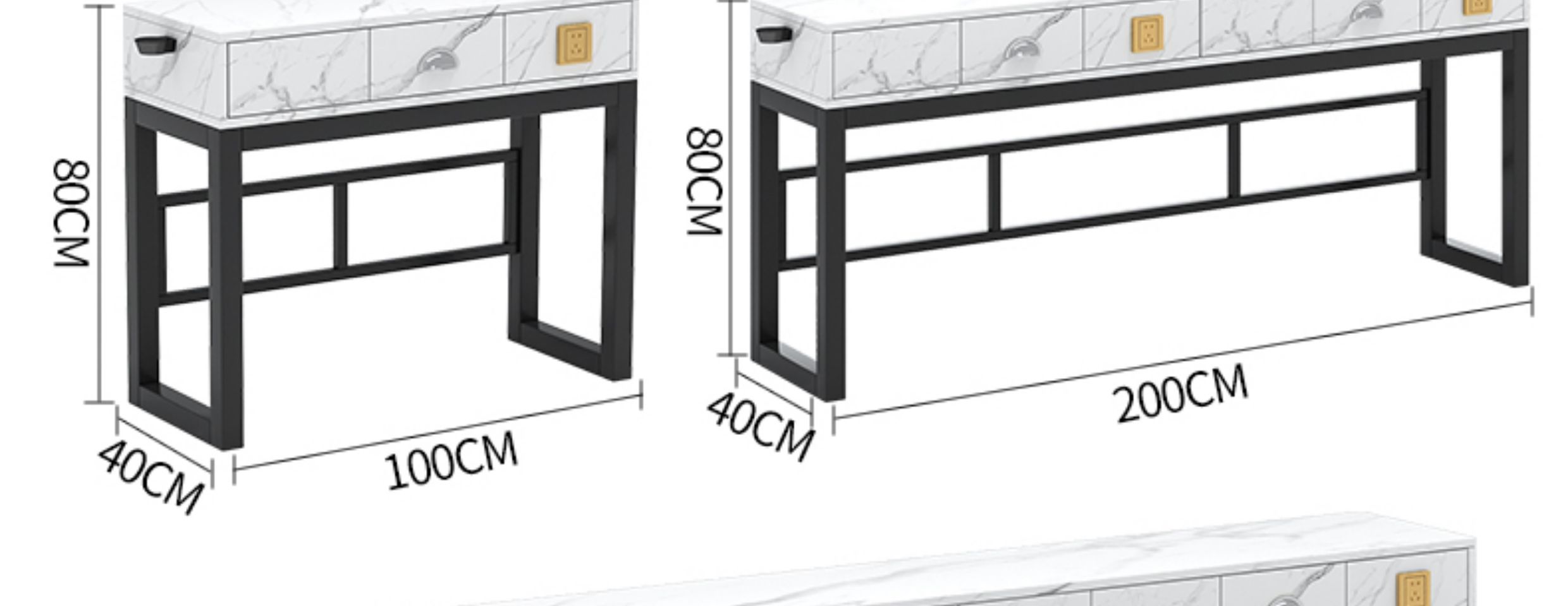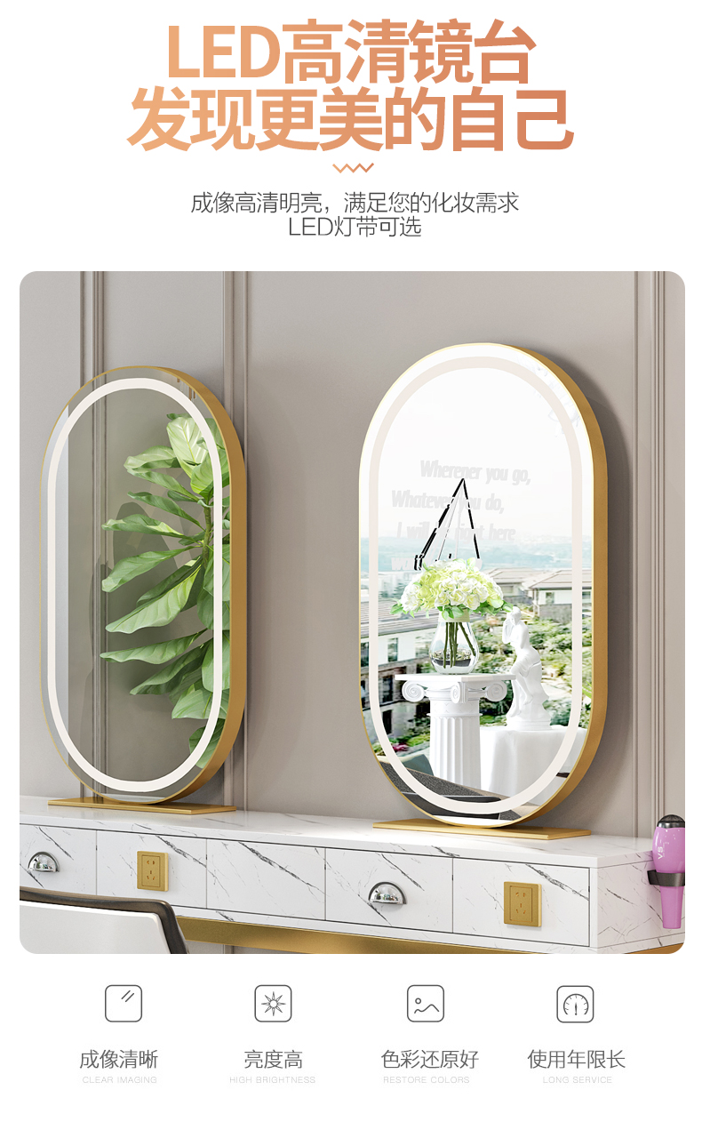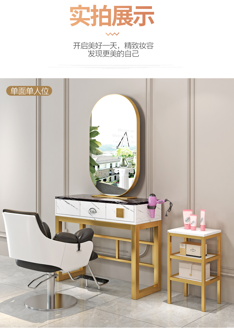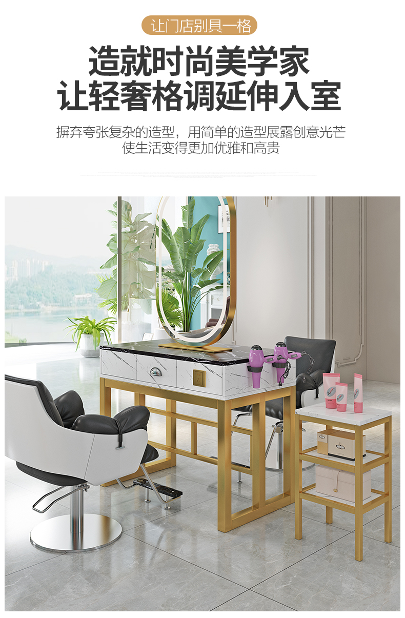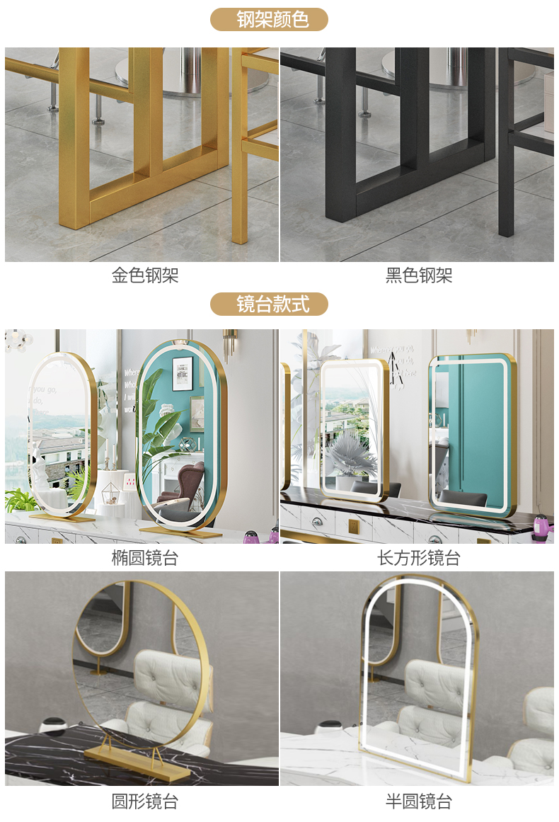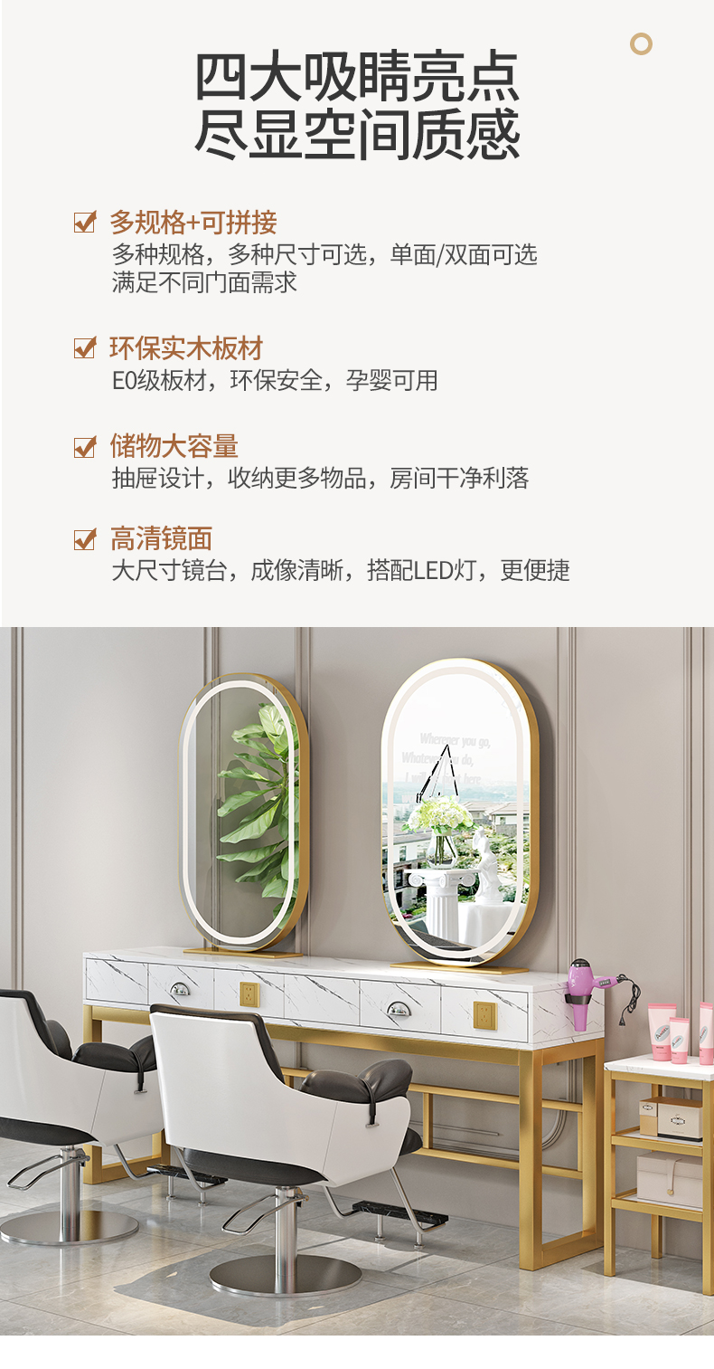 新しい理髪ミラーテーブル、美容室、片面ヘアカットミラーキャビネット、一体型ヘアサロン大理石、ライト付き両面パーマ