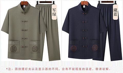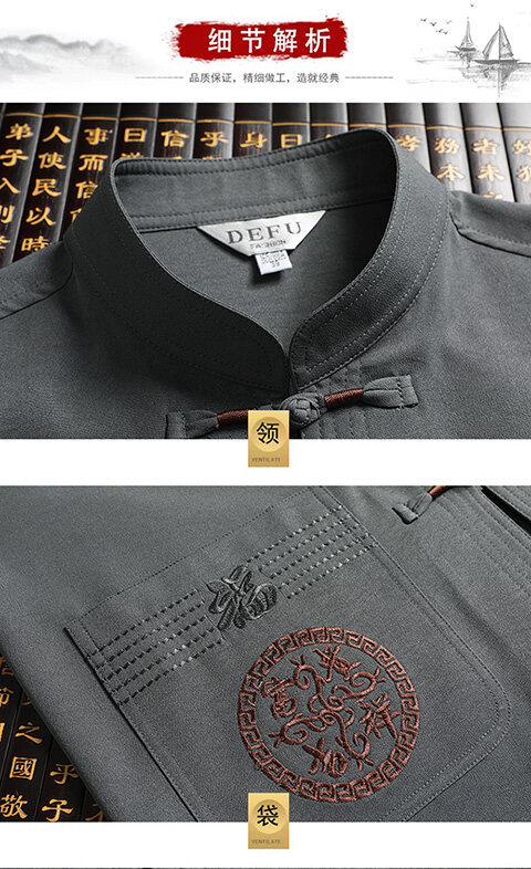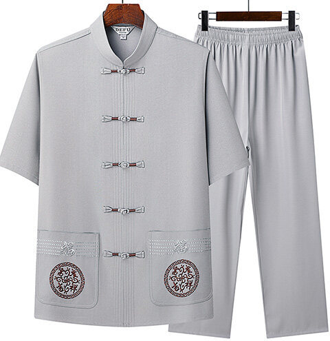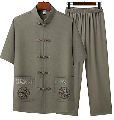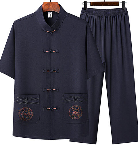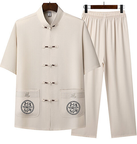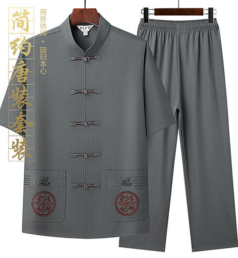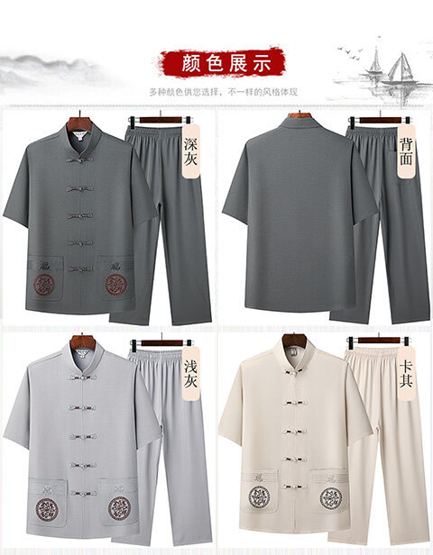 夏のメンズ唐装、中国風刺繍入りお父さん服、中高年向け半袖唐装、越境販売、レトロシャツ