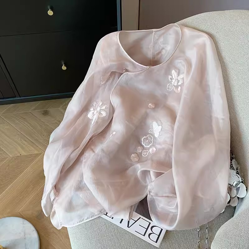 ピンク重工刺繍斜襟新中国式欧根紗シャツ女性夏国風優しい気質日焼け止めブラウス上着