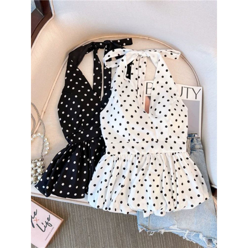 フレンチポルカドットビューティーバックホルターネックベスト女性の夏スリムウエストノースリーブアウターデザインホットガールバドトップ