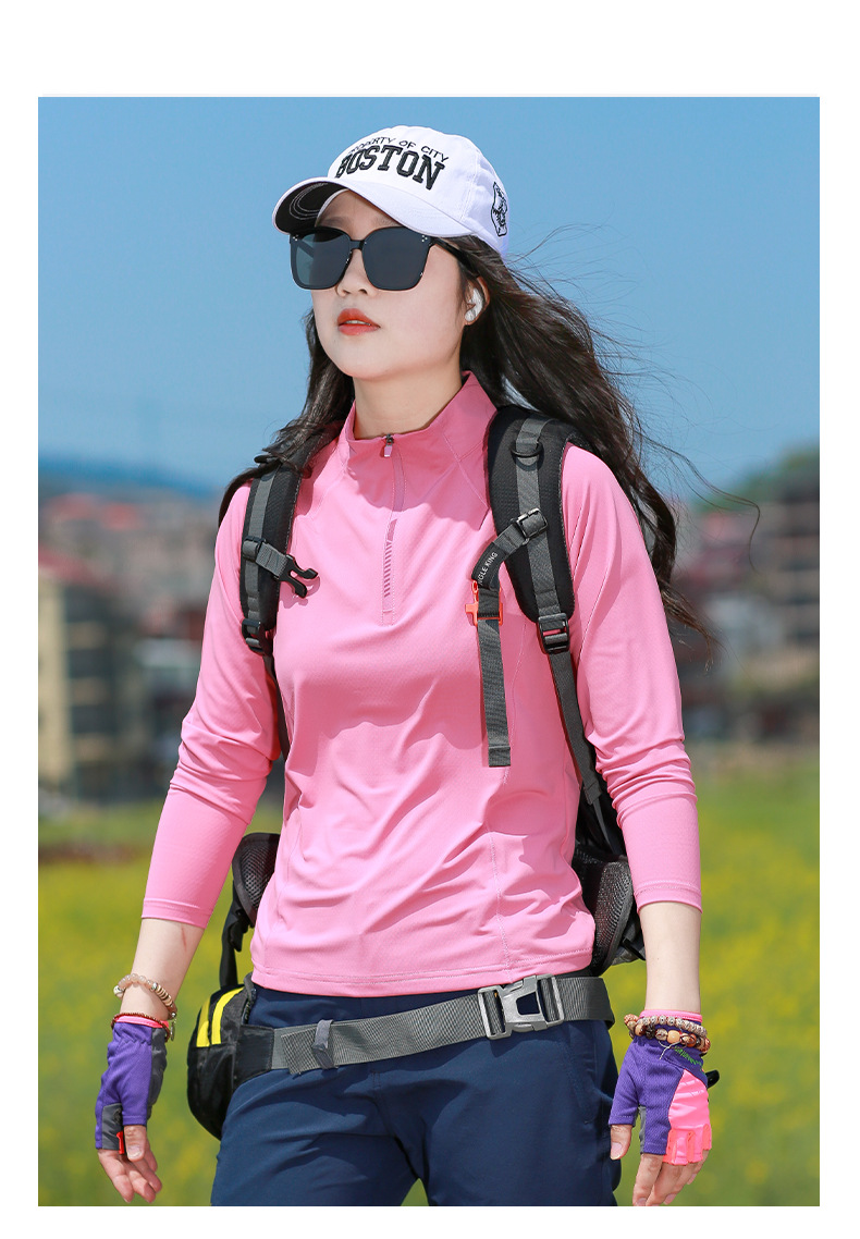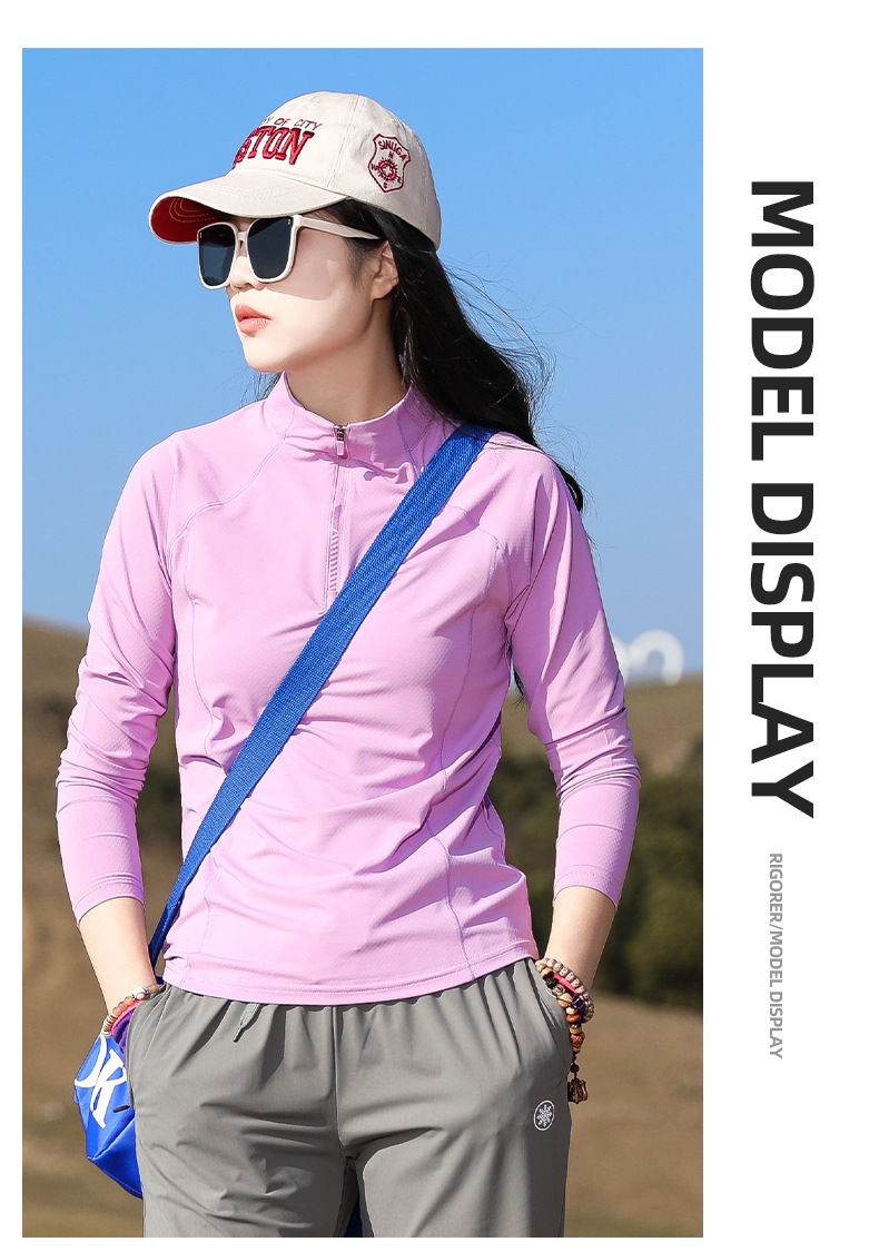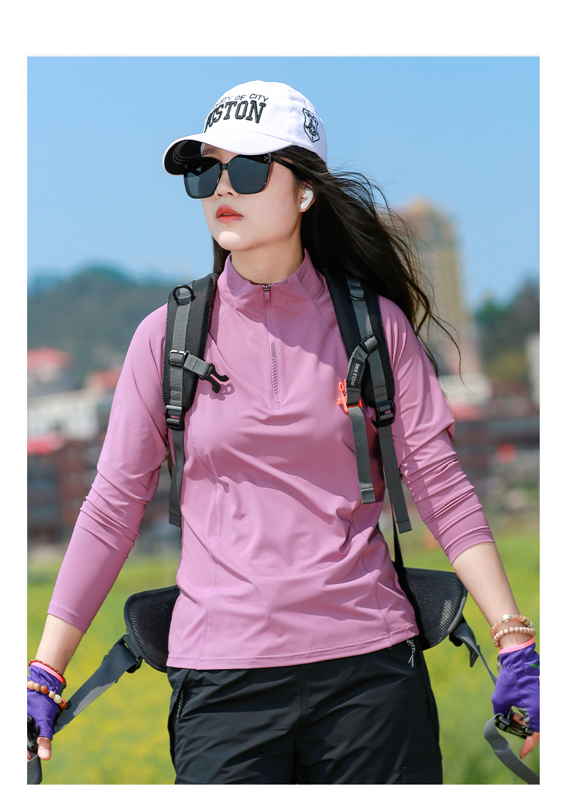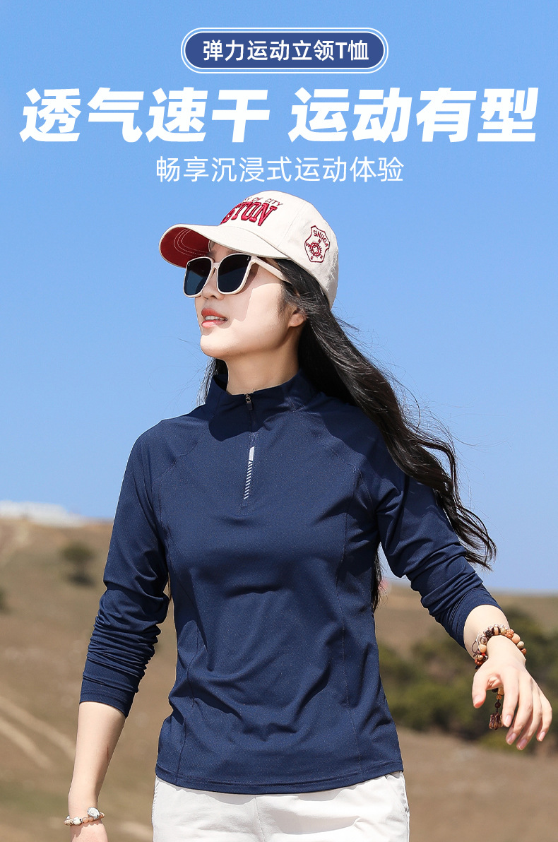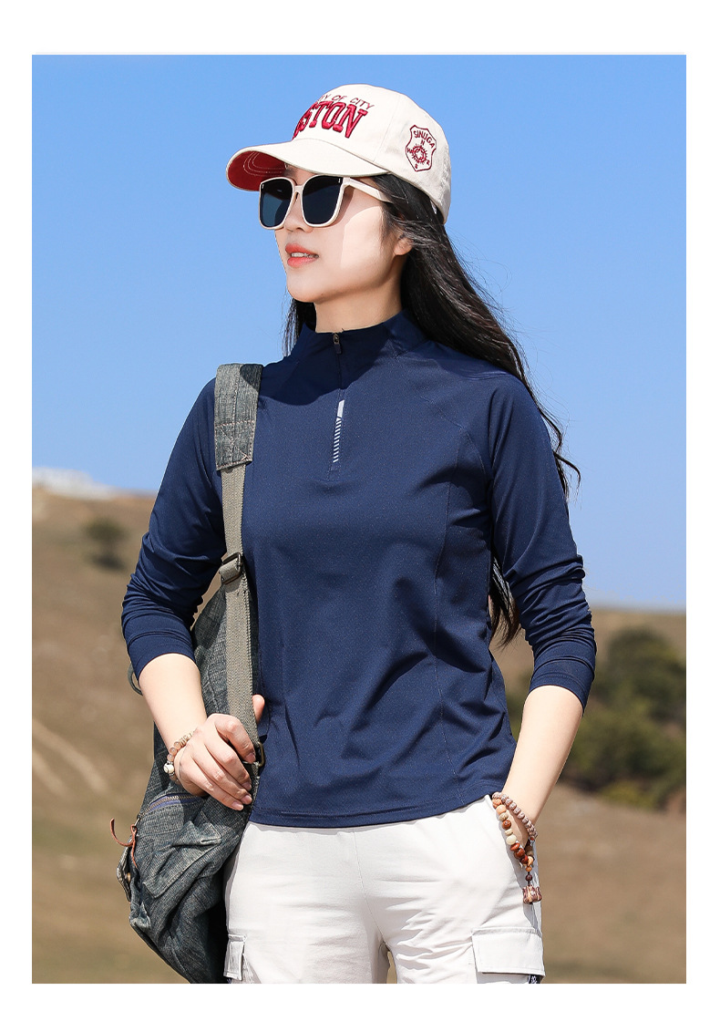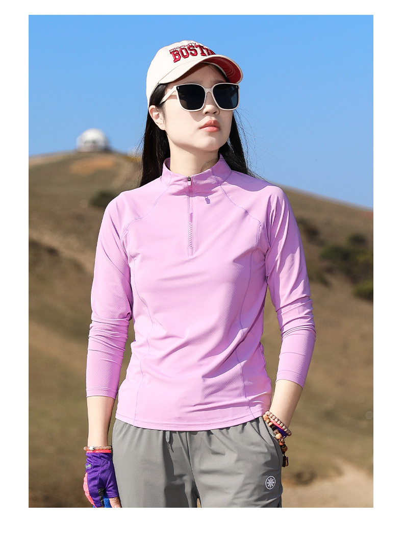 アウトドアスポーツ速乾tシャツ春秋夏軽薄弾力運動通気性女性立襟長袖日焼け止め快乾上着