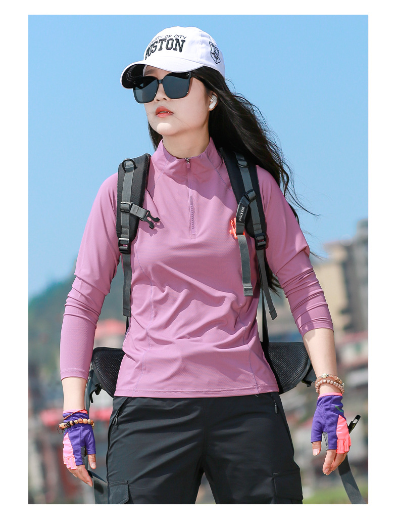 戸外春夏日焼け止め登山徒歩弾力快乾衣立襟ランニングフィットネス通気長袖速乾tシャツ女