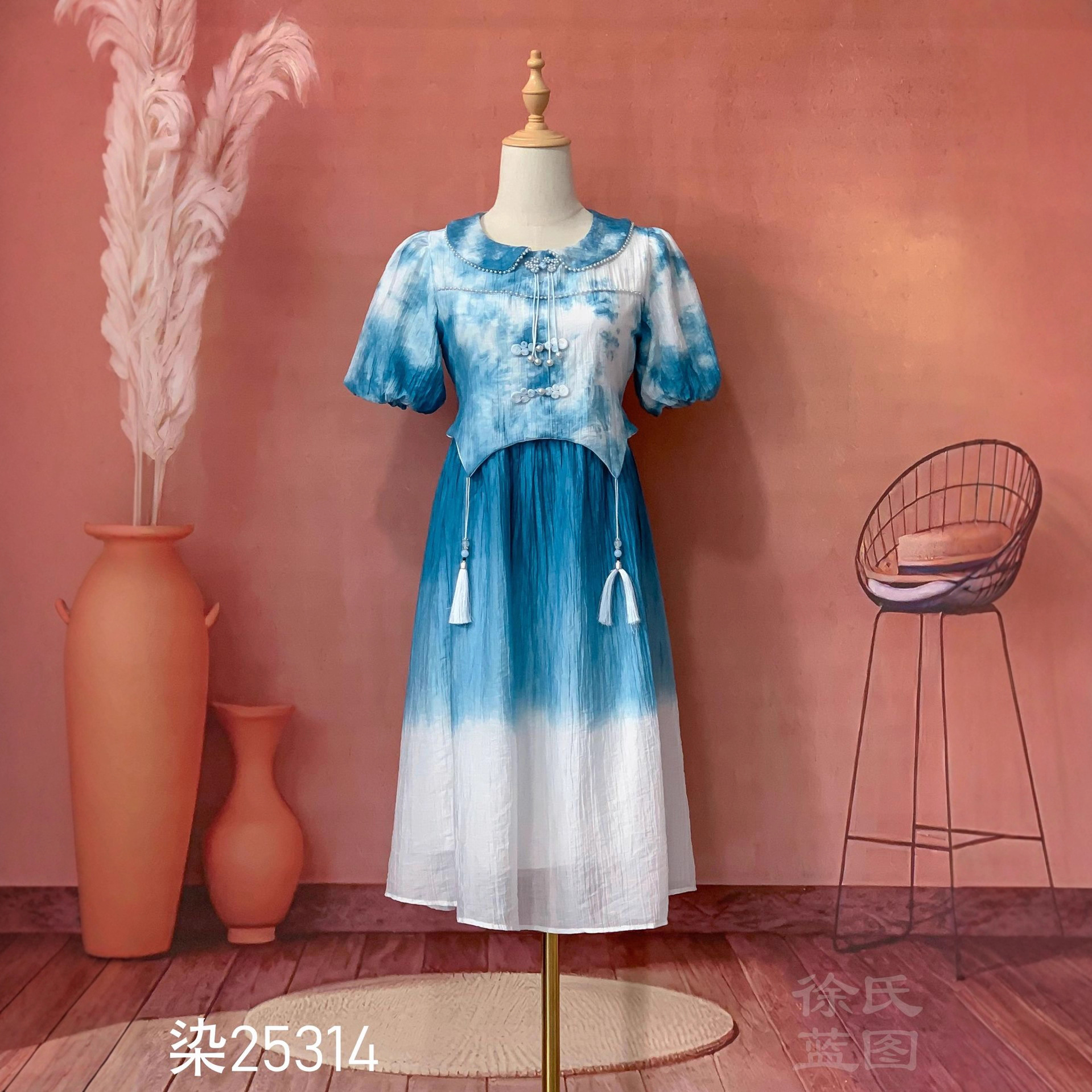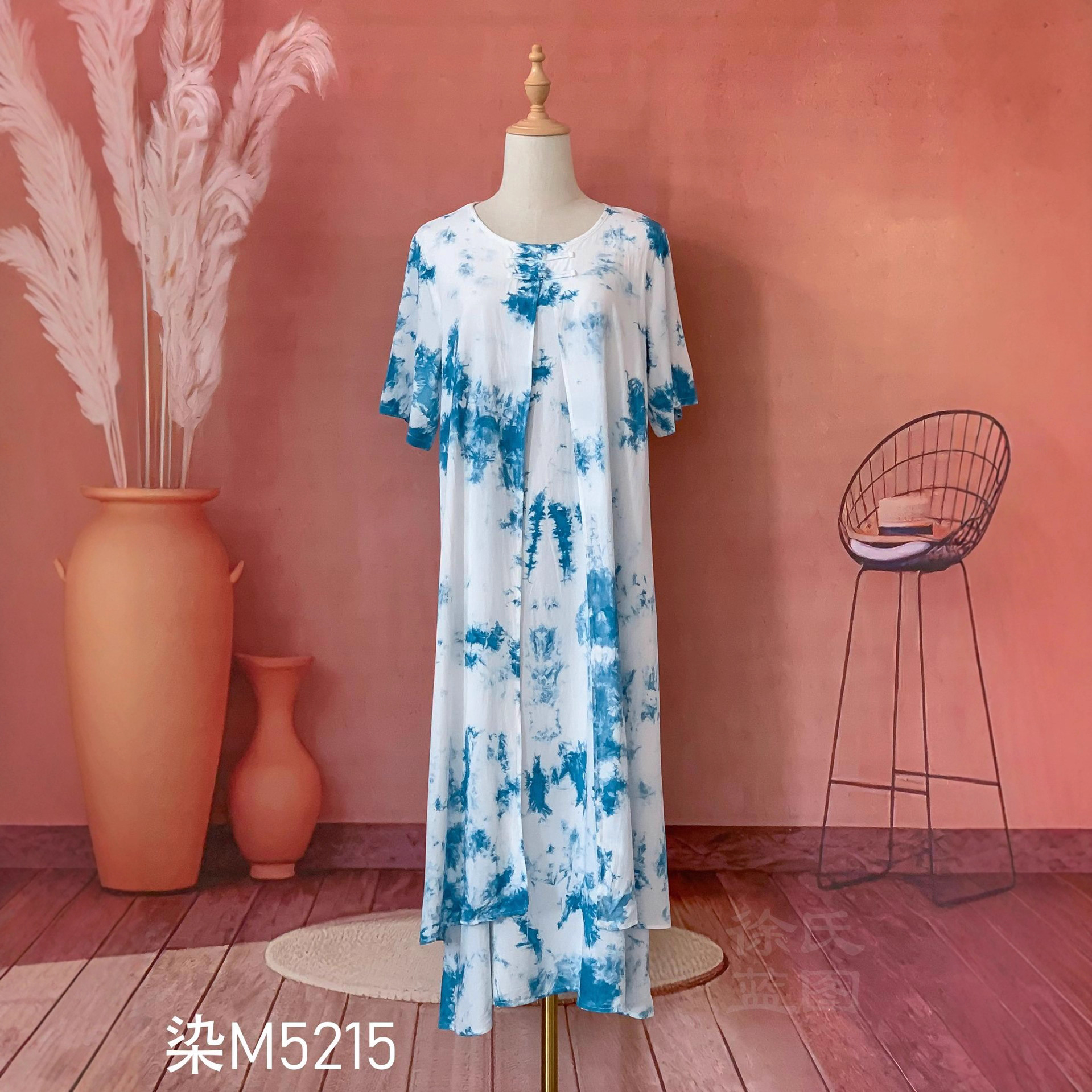 大理手工扎染新中式连衣裙夏季休闲盘扣蓝染假两件宽松长裙