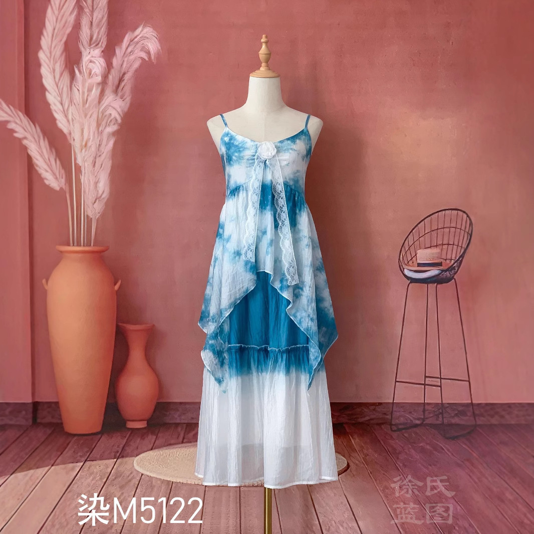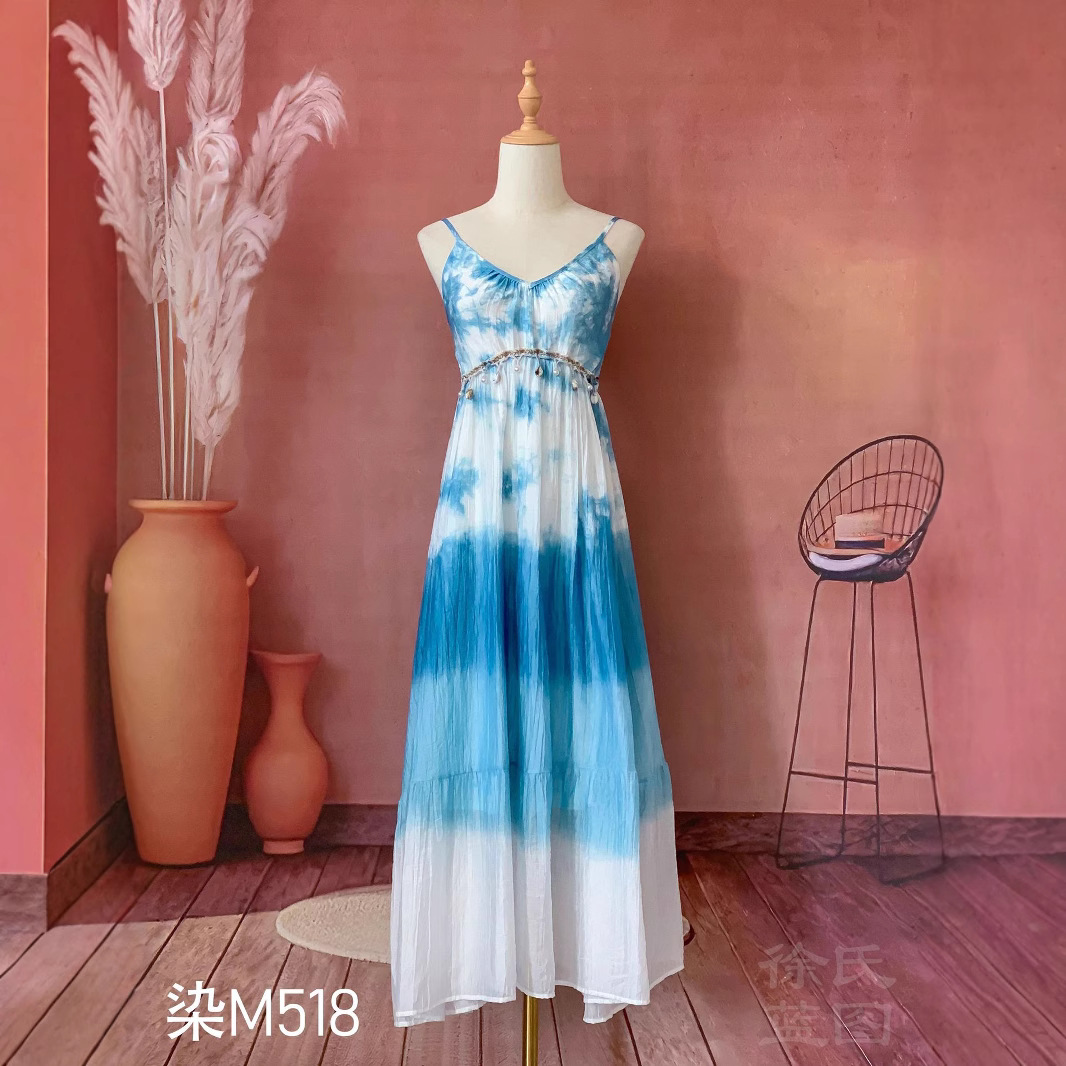 大理手染め民族風ワンピース夏カジュアルリゾートビーチスカート藍染ウエスト気質サスペンダースカート