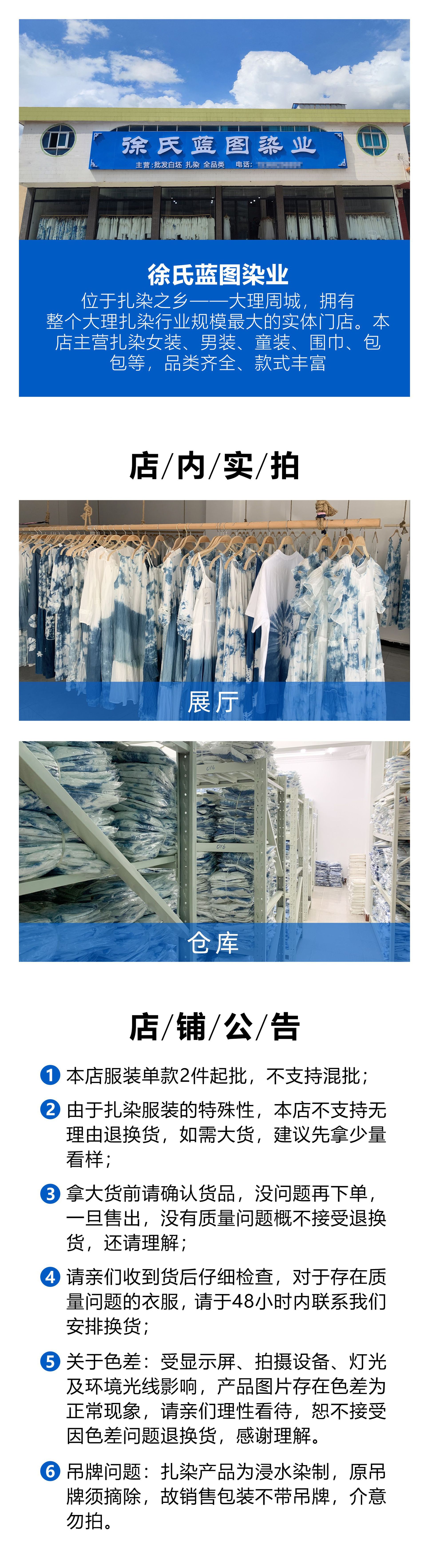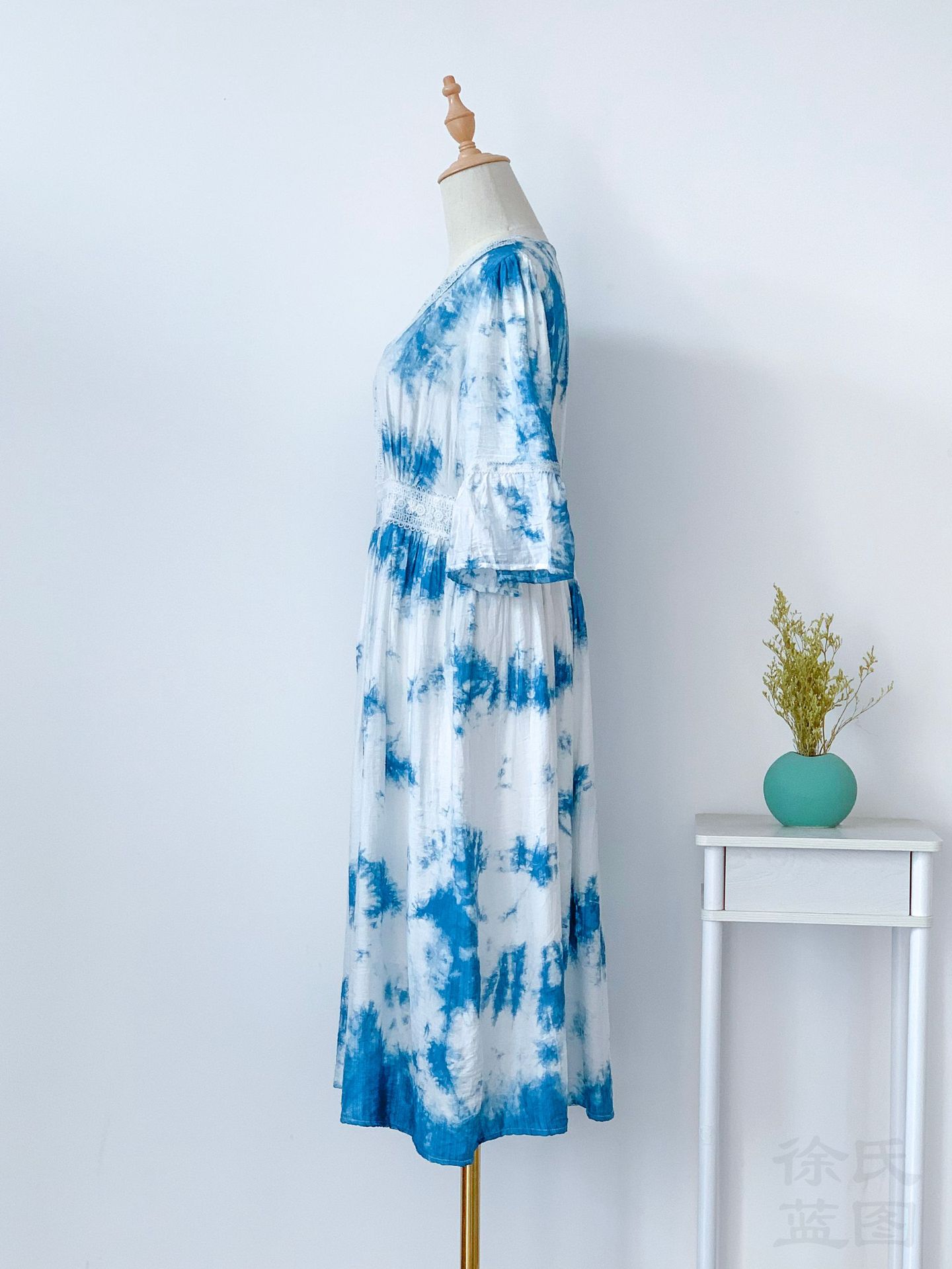大理手工扎染民族风连衣裙夏季文艺蓝染收腰短袖中长裙(大童款)