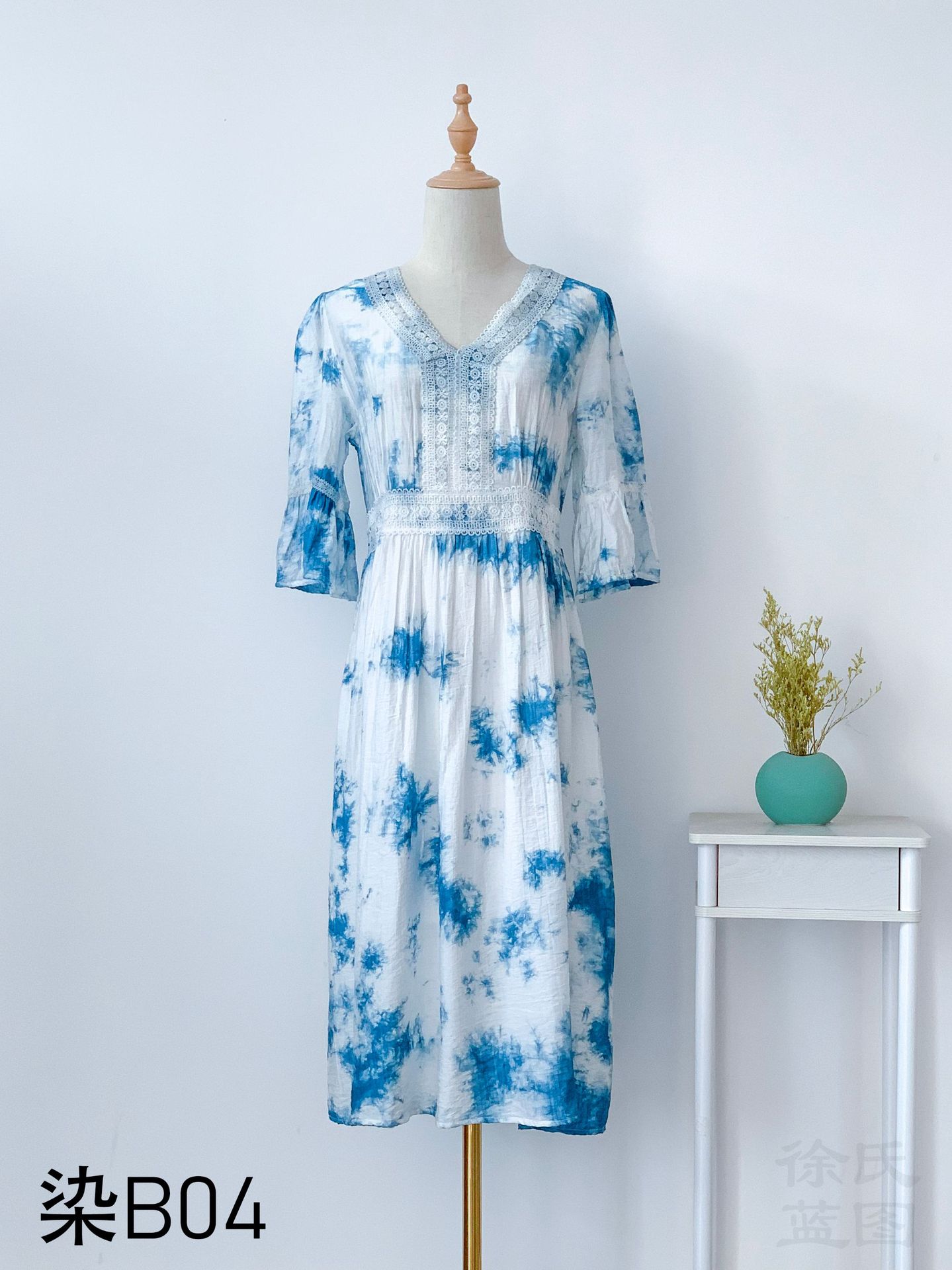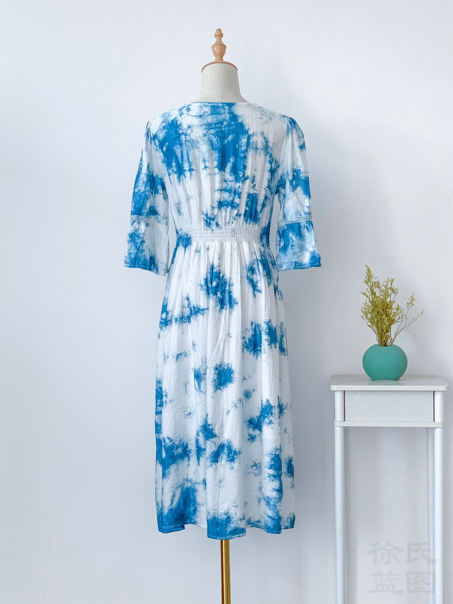 大理手作り染民族風ワンピース夏旅行休暇ゆるい中国風藍染ロングスカート #3561