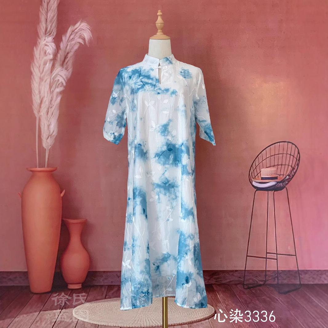大理手染め民族風ワンピース夏旅行休暇ゆるい新中国式立襟ロングスカート #3336