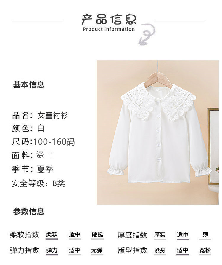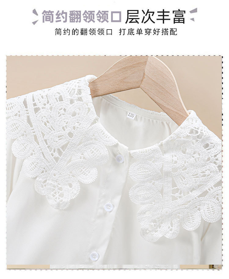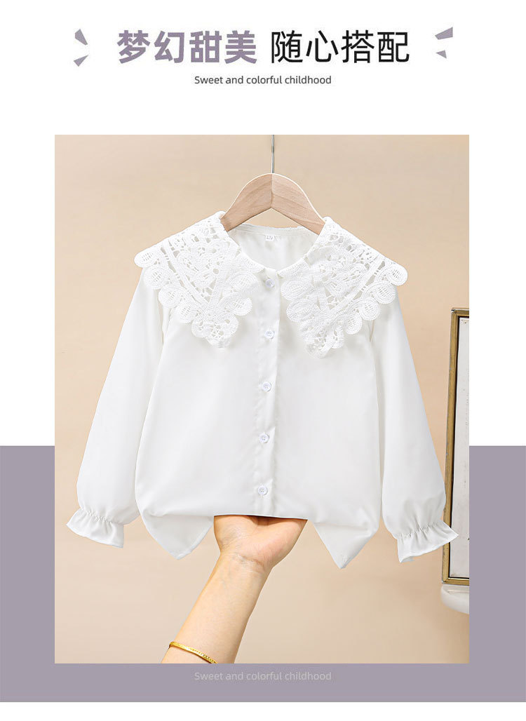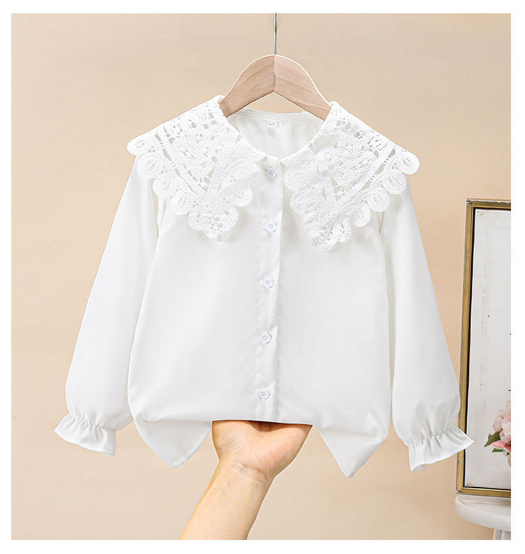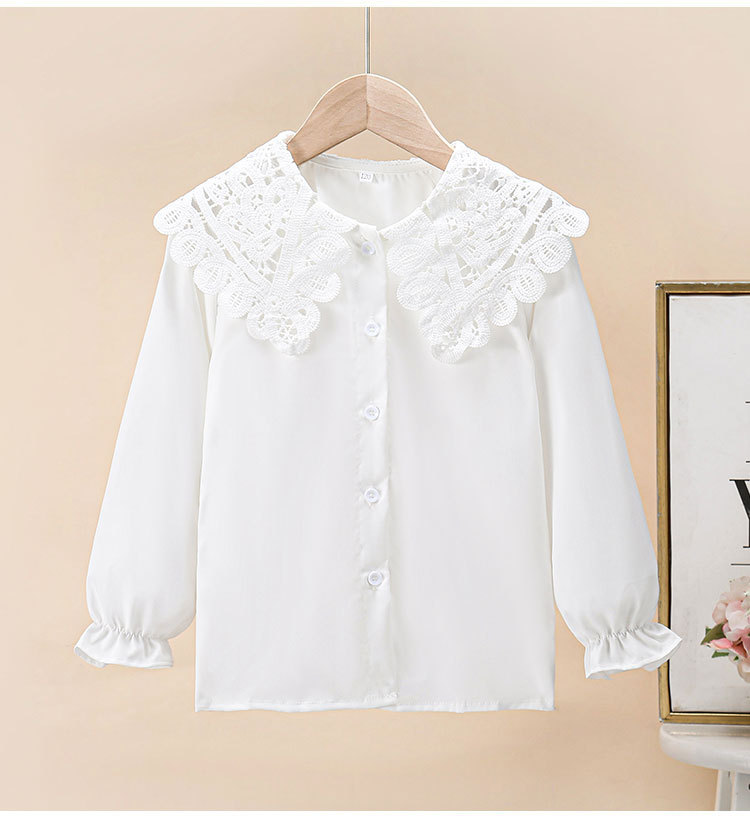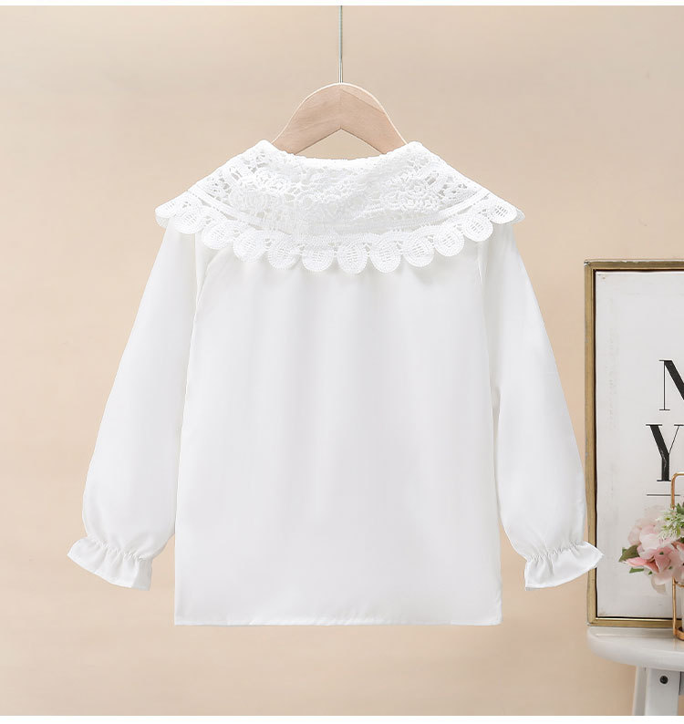 海外の女の子向け春秋新作シャツ、おしゃれな長袖白シャツ、子供用フリルレースドールカラーインナー