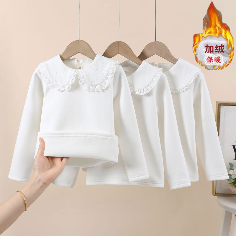 女童长袖t恤春秋新款加绒白色打底衫女孩洋气打底娃娃领花边上衣