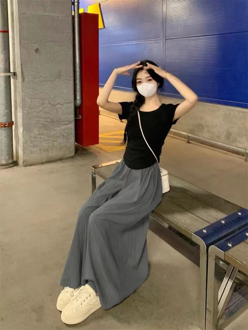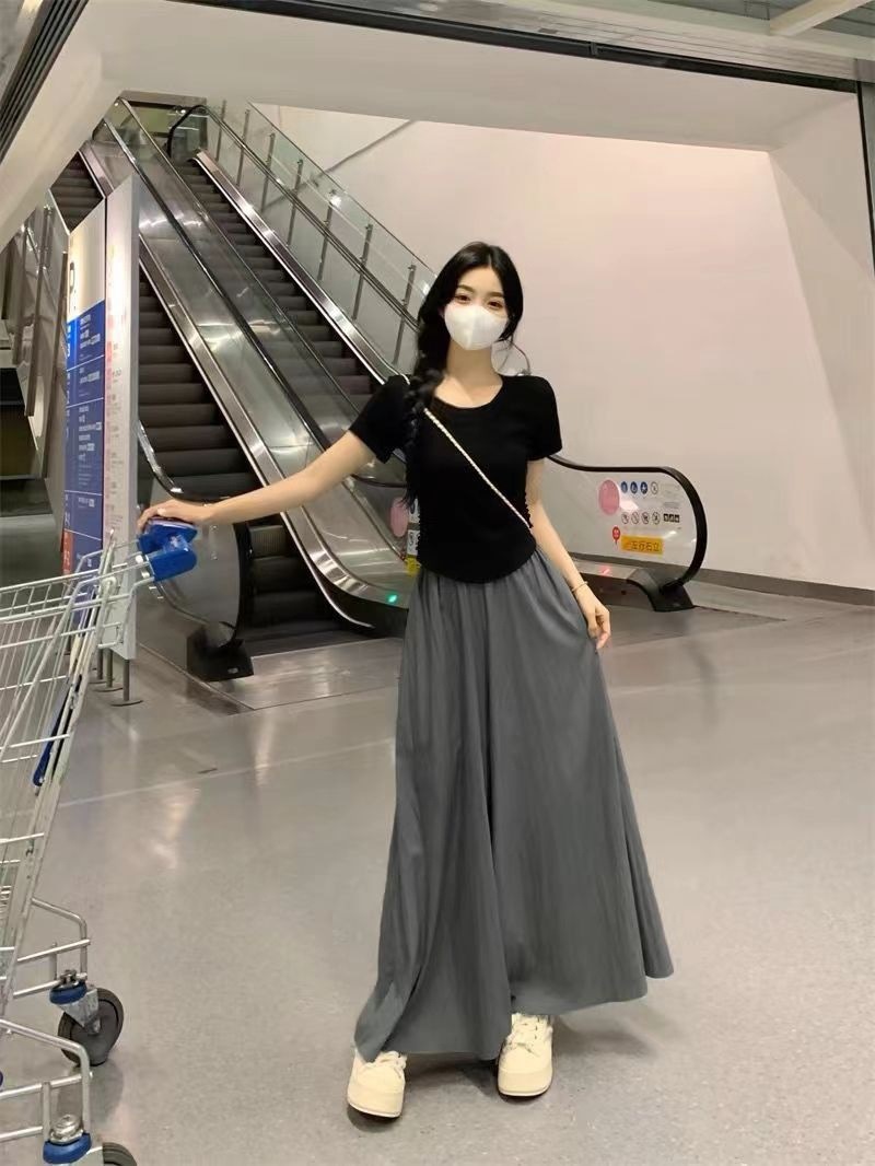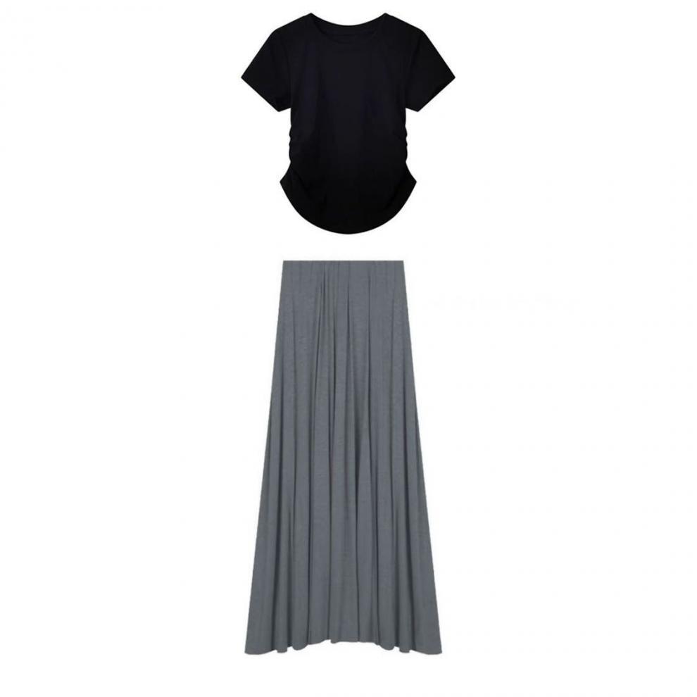 ウエスト絞りブラックトップス[単品],グレースカート[単品],黒のトップス+スカート【2点セット】