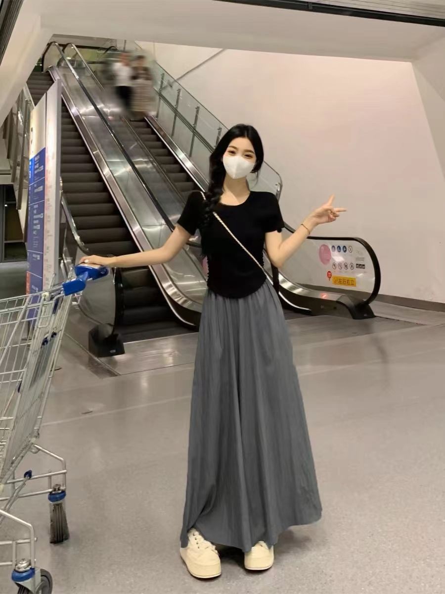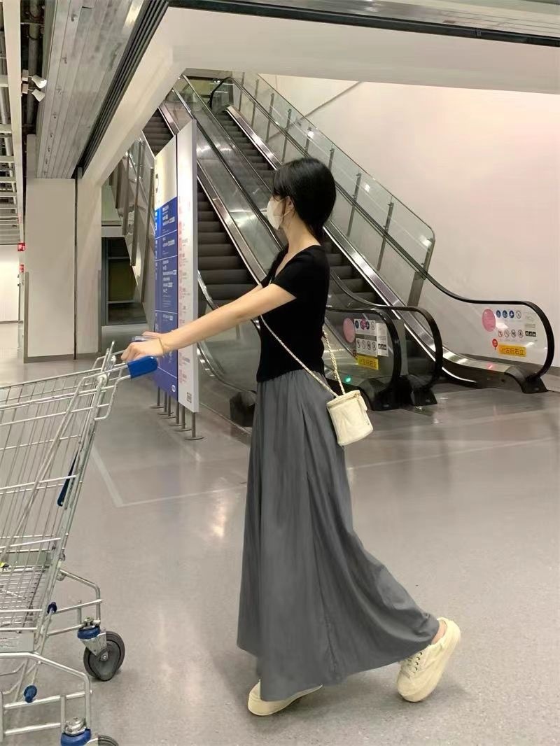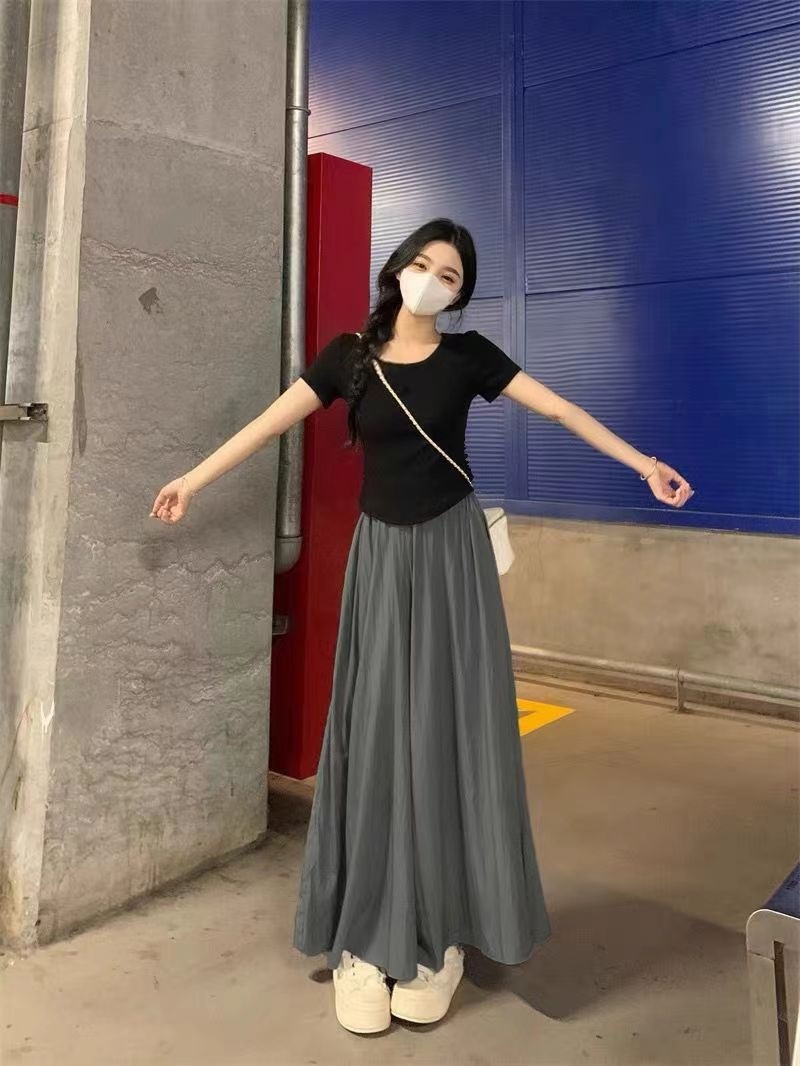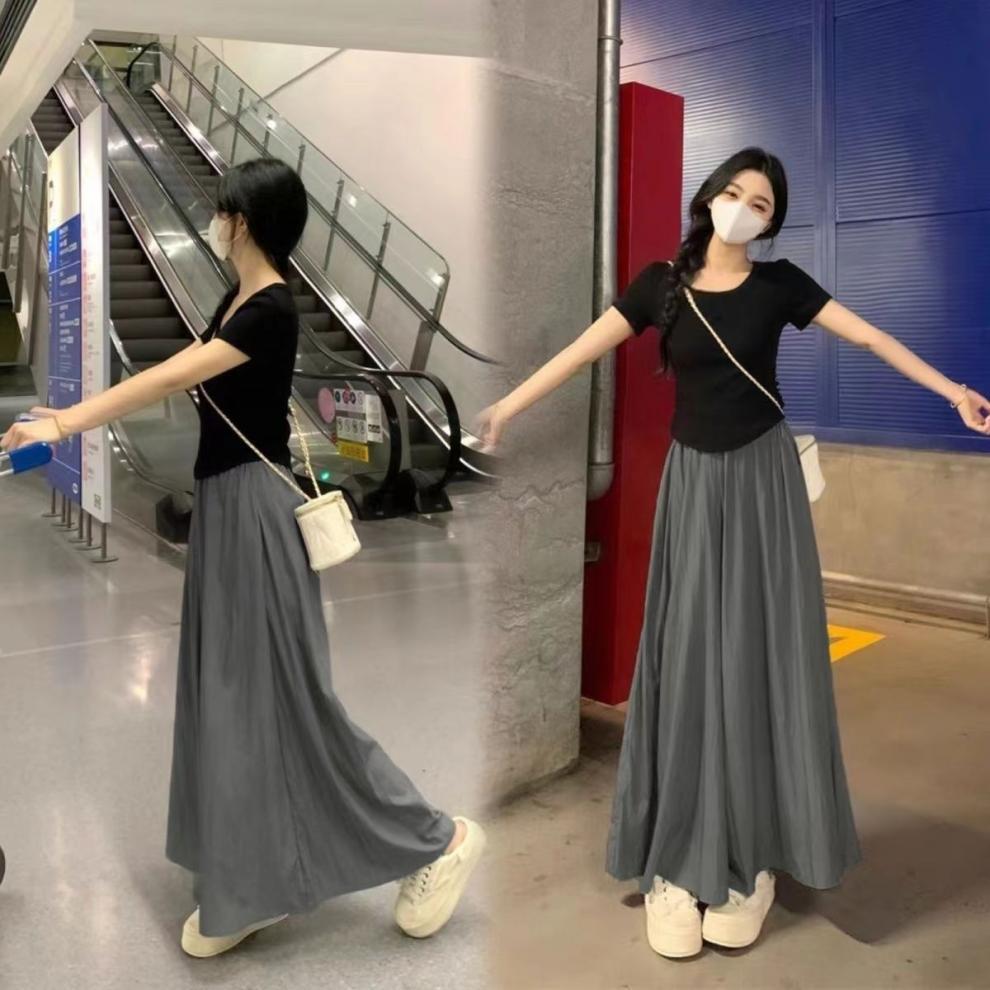 フレンチスタイル半袖ウエストマークTシャツトップス+ハイウエスト膝丈スカート レディース 夏 Aラインスカートセット 着痩せ効果