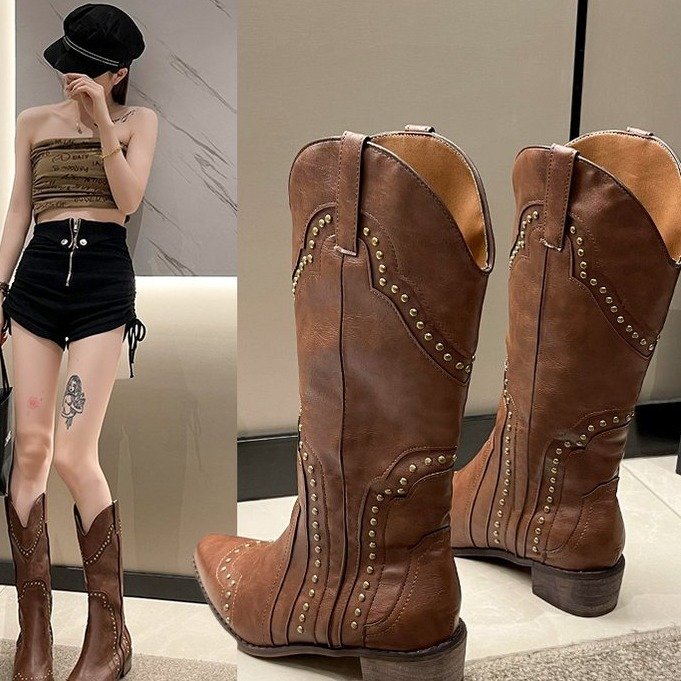 高級感のあるレトロなスタッズ付きロングブーツ レディース 2025秋冬新作 欧米風 ポインテッドトゥ ミドルヒール ウエスタンブーツ 旅行ブーツ