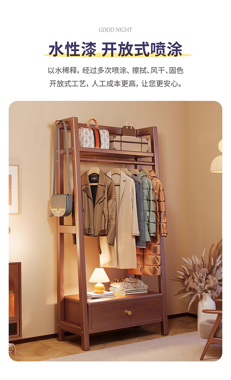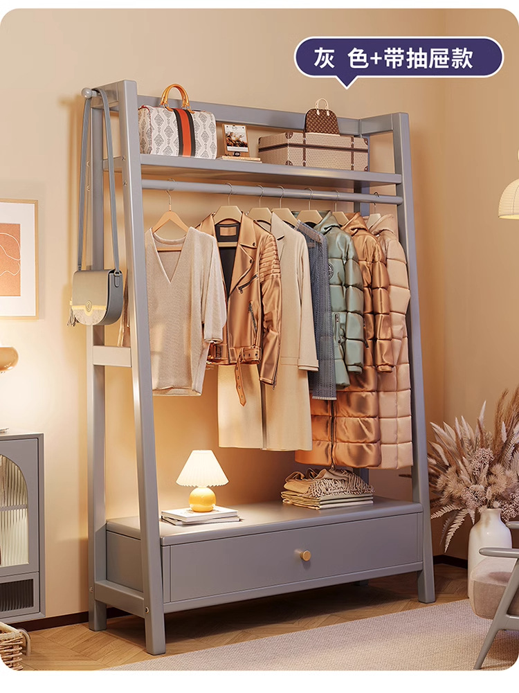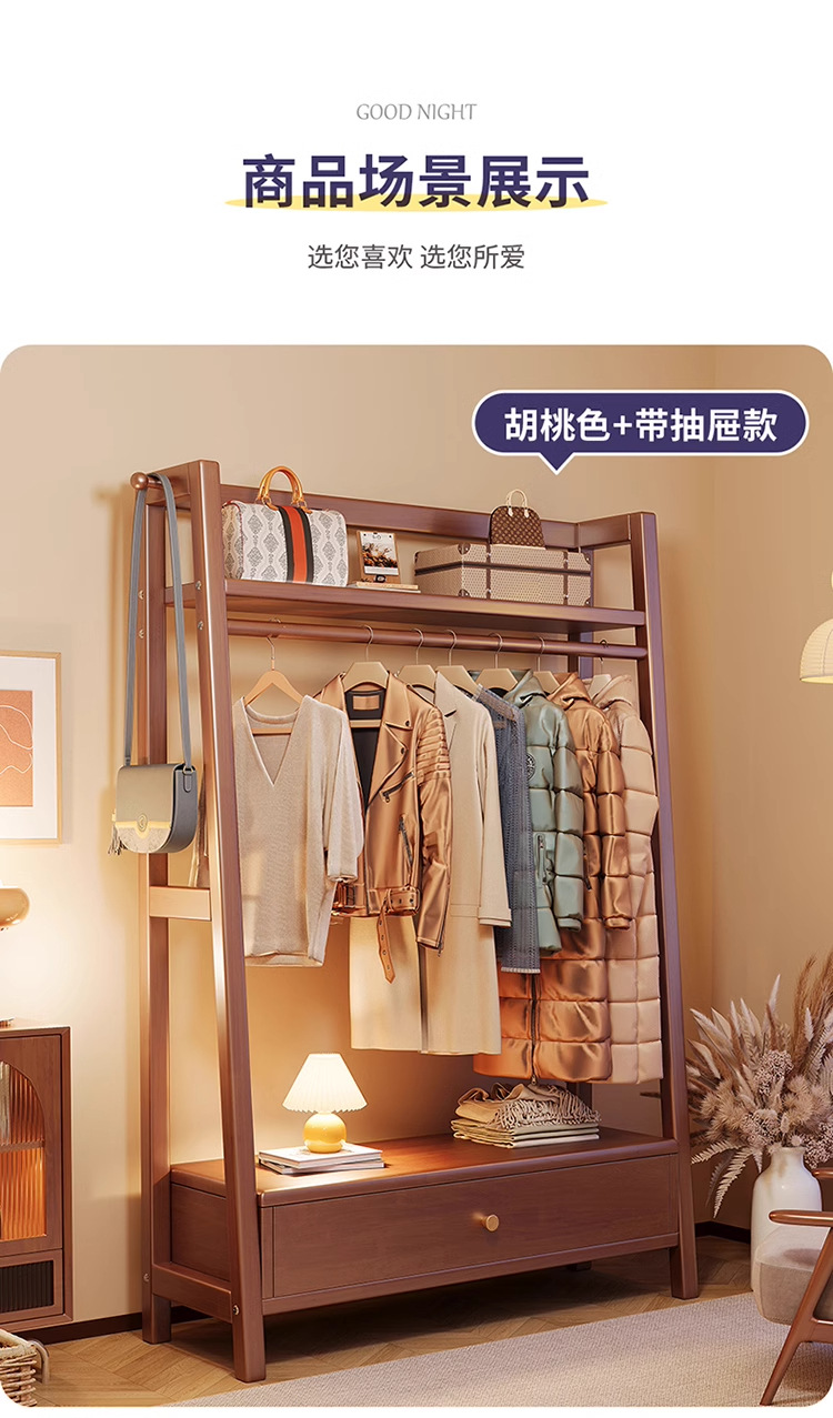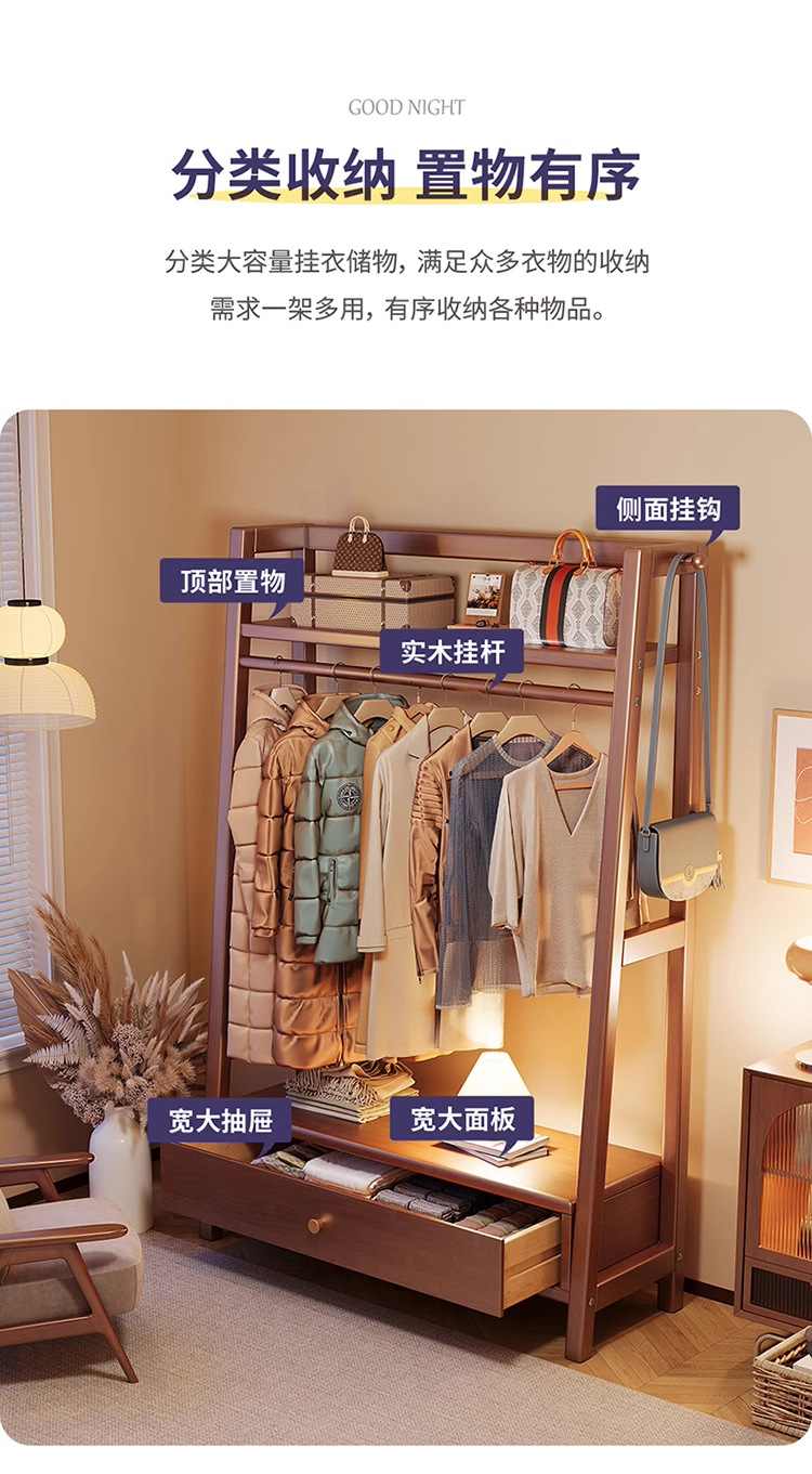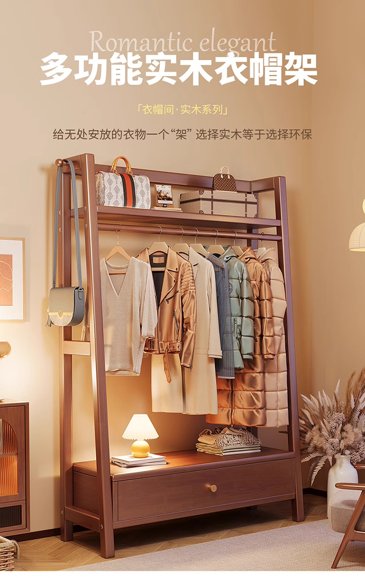 实木衣帽架落地衣架 家用卧室挂衣架带抽屉收纳置物架