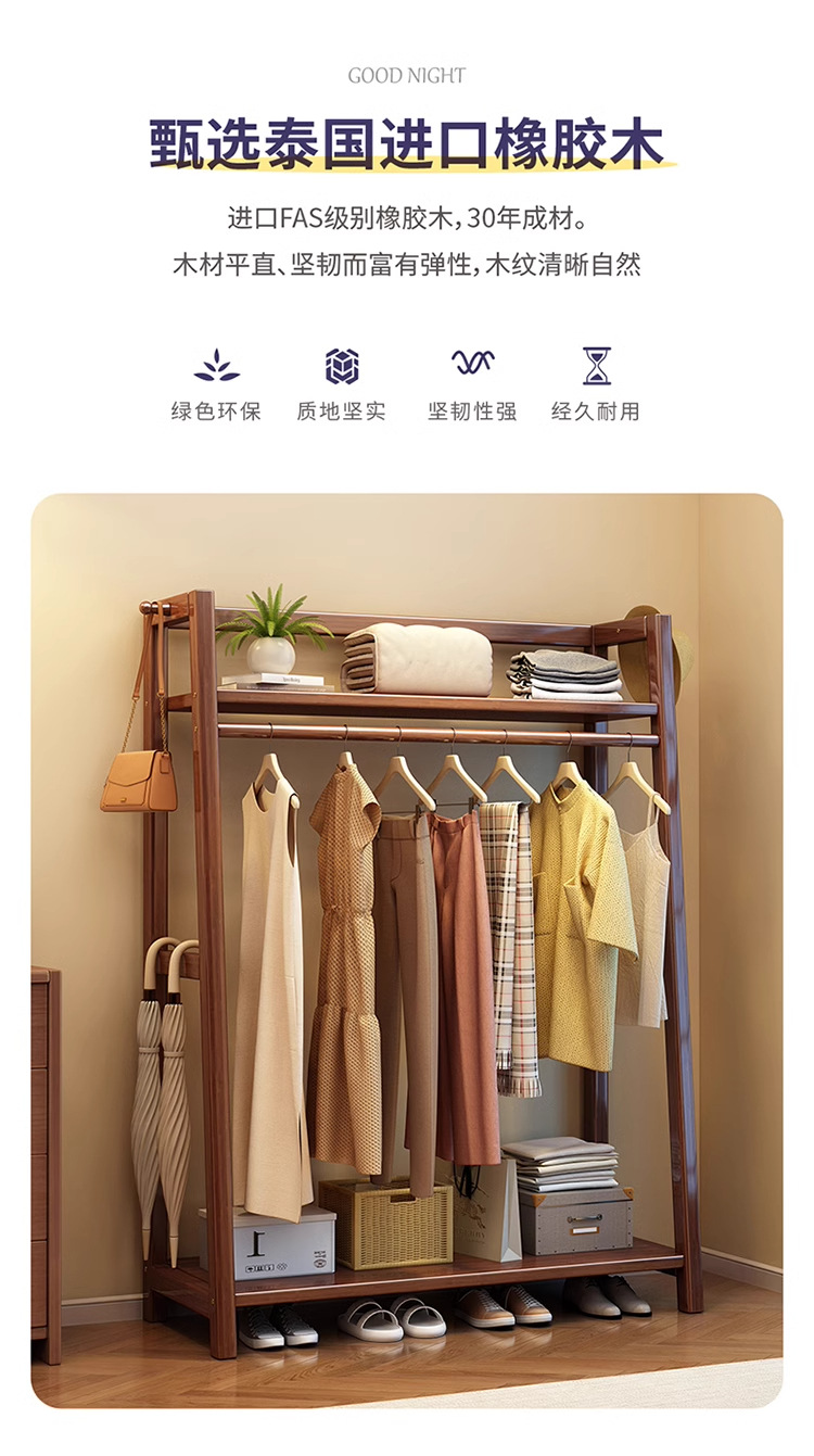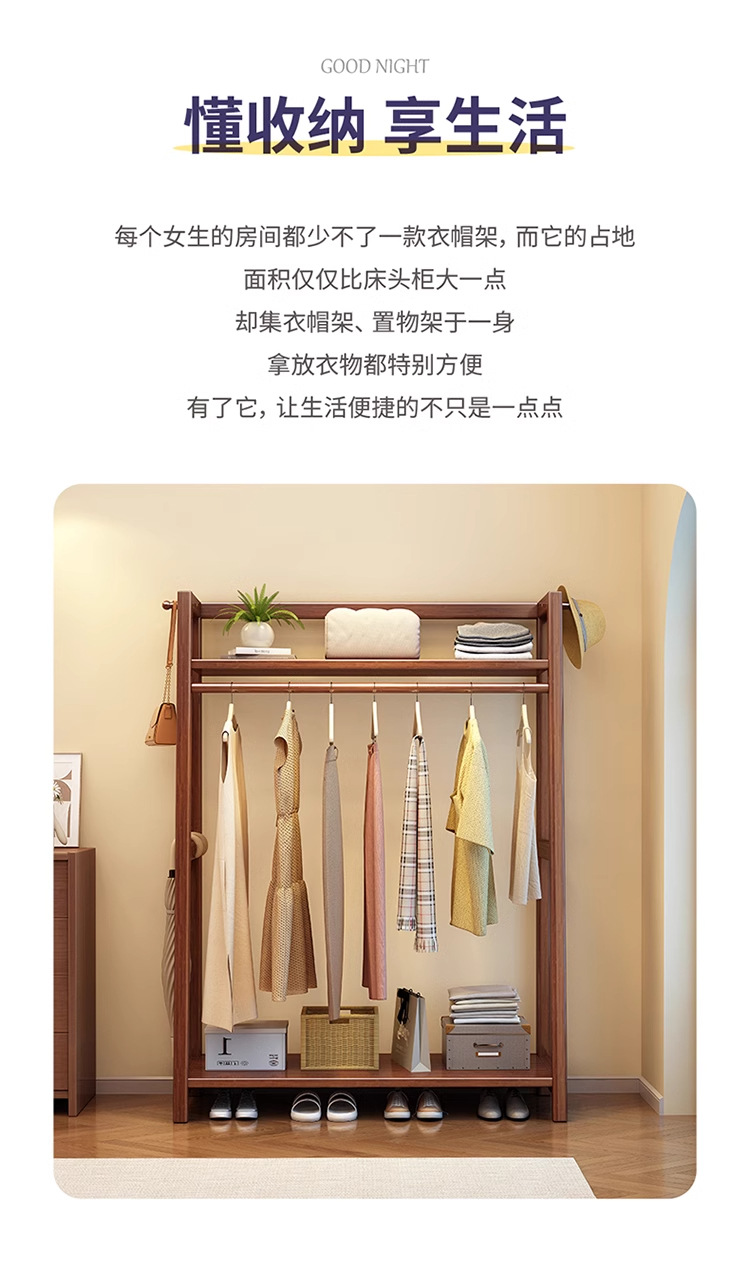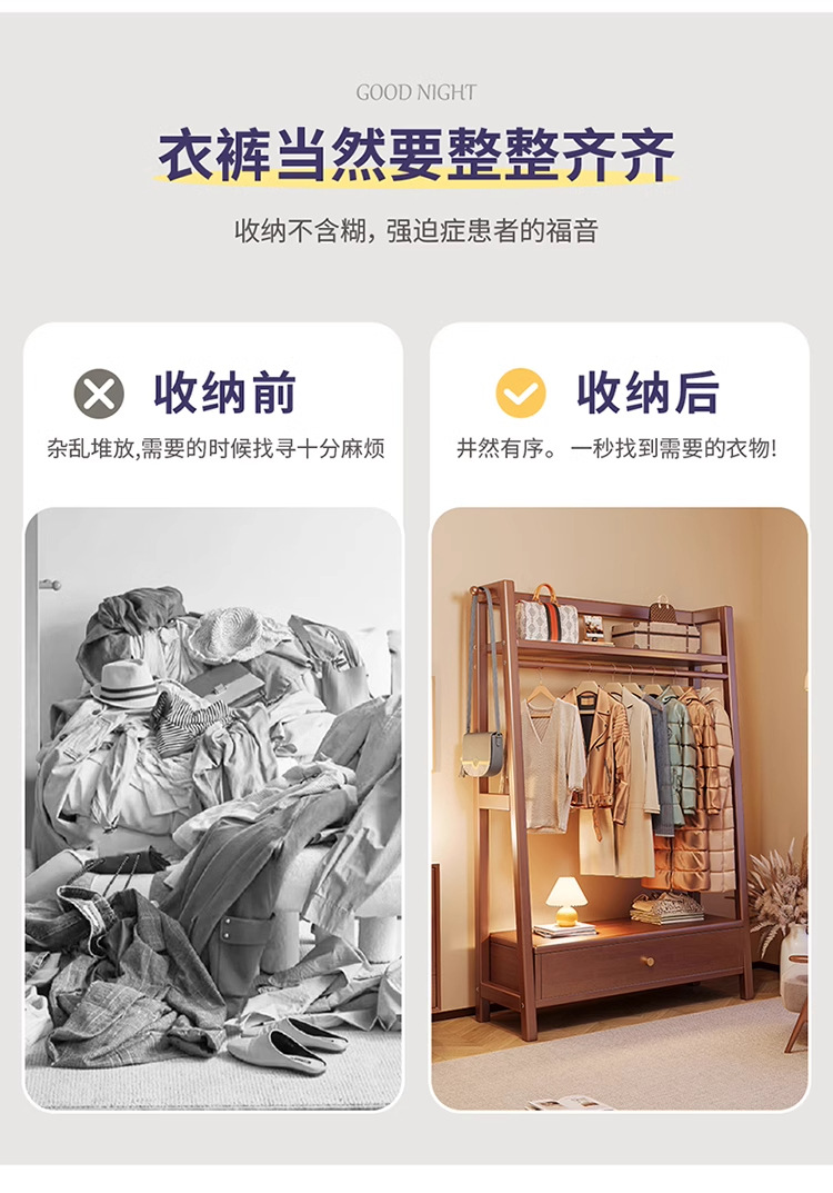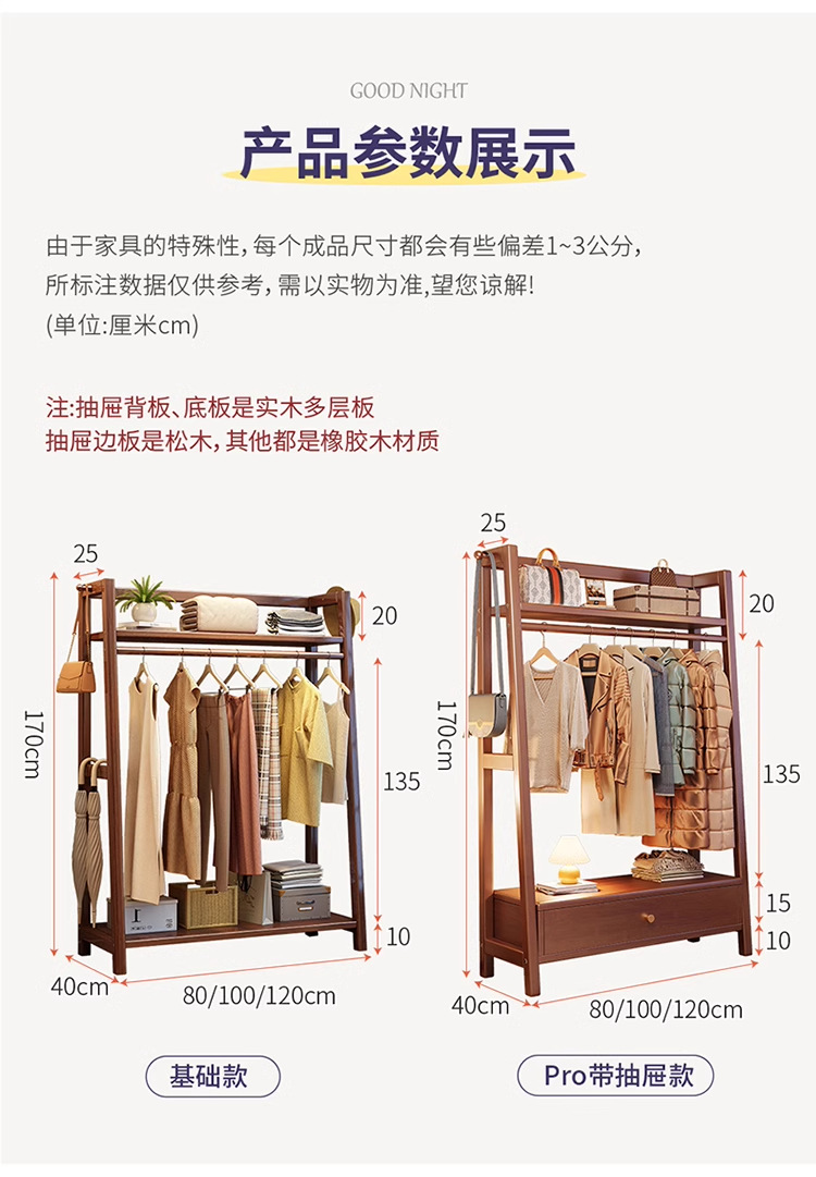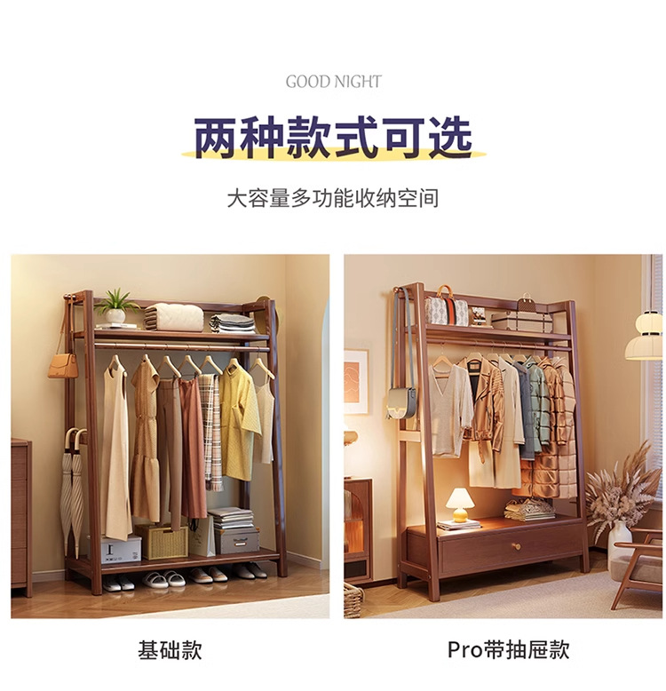 实木衣帽架落地衣架 家用卧室挂衣架带抽屉收纳置物架