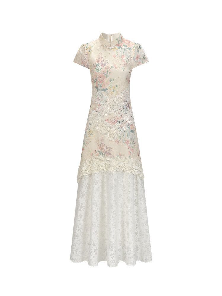 春の絶美の新しい中国式の改良のチャイナドレスの夏の新型の女性の夏のレースの偽の2つの透かし彫りの花のワンピース