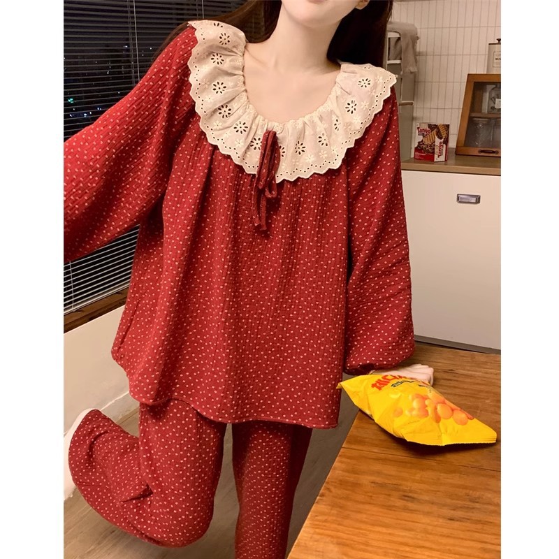 フランス式お姫様風パジャマ女性春秋タイプ長袖雲綿ガーゼ家庭服赤い花セット春秋