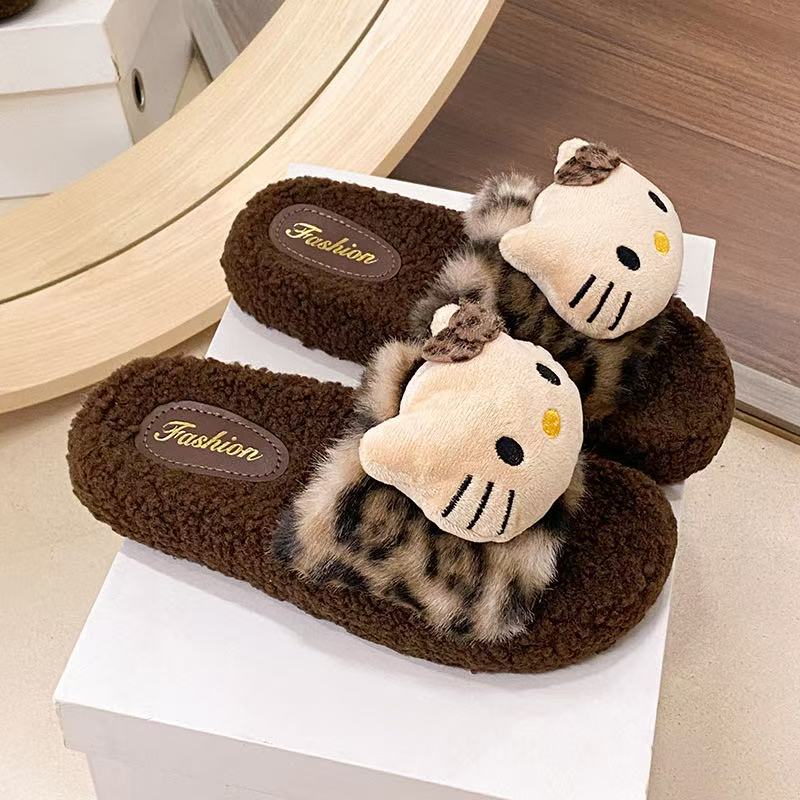 かわいいヒョウ柄猫モチーフのふわふわスリッパ 女性用 2025年秋冬新作 室内用滑り止め スーパー卸売 綿スリッパ
