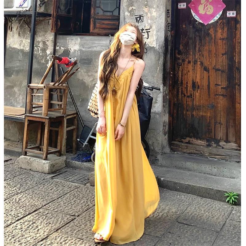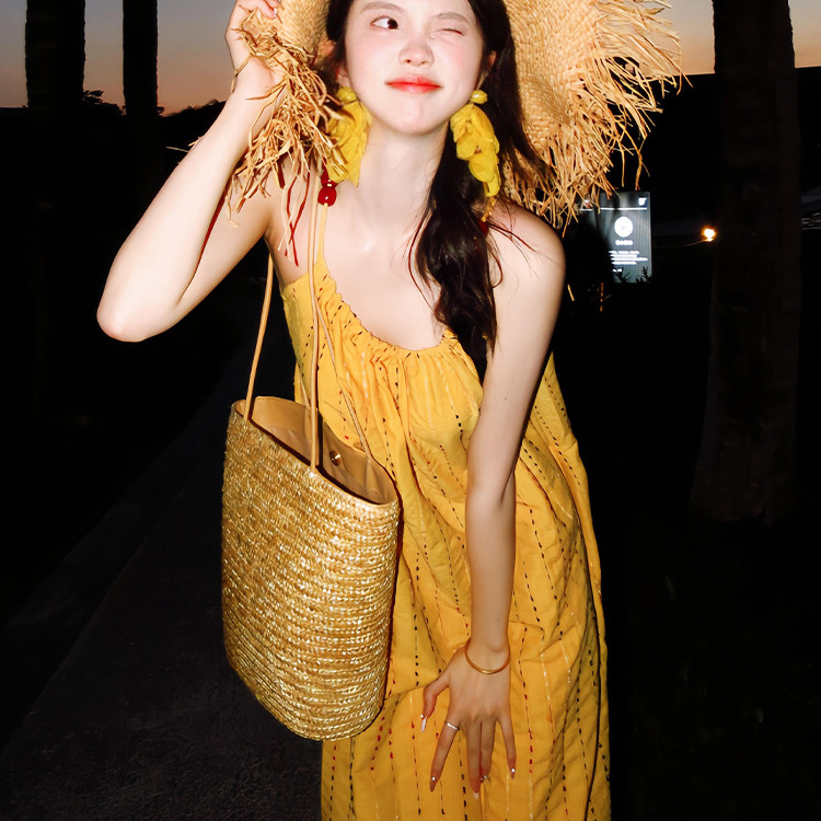 2025年夏の新しい黄色のサスペンダードレス、今年人気の女性用ビーチバケーションスタイルビーチロングドレス