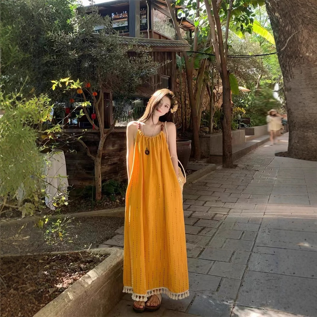 レイジーでリラックスしたイエロータッセルサスペンダーホワイトドレス海辺の休暇気質ロングドレス美しいビーチドレス夏