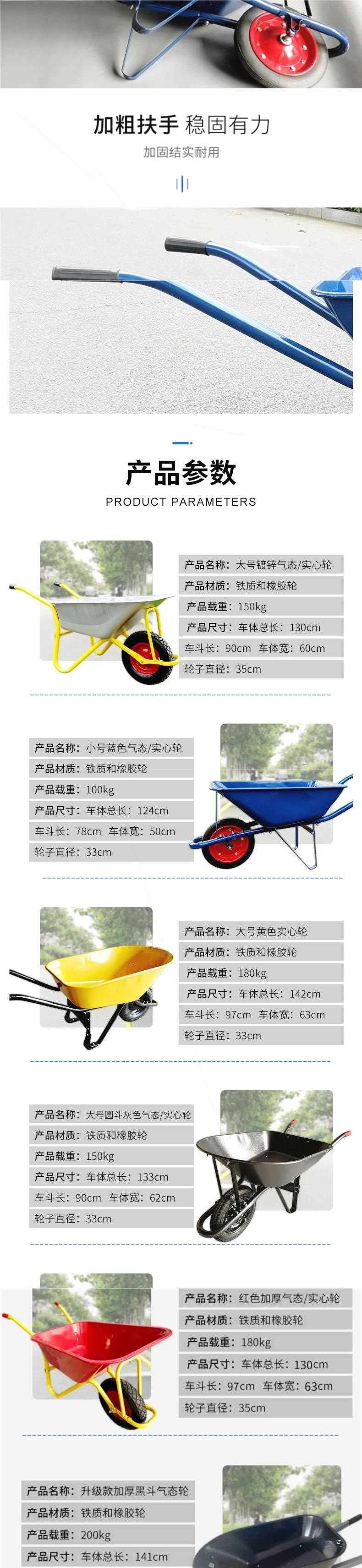 青い一輪車(空気入りタイヤ)積載量100kg,黄色の手押し車(空気入りタイヤ)耐荷重100kg,青い一輪車(ソリッドタイヤ)積載量150kg,黄色の手押し車(ソリッドタイヤ)積載量150kg,青色二輪車(空気入りタイヤ)積載量160kg,青色二輪車(ソリッドタイヤ)積載量175kg