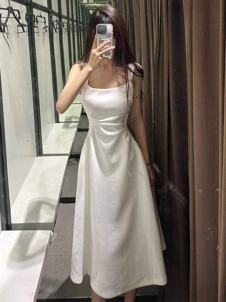 フレンチスタイルのウエストシェイプホワイトキャミワンピース、高級感のあるロングドレス、2025年新作夏物、小柄な女性向けフェアリードレス