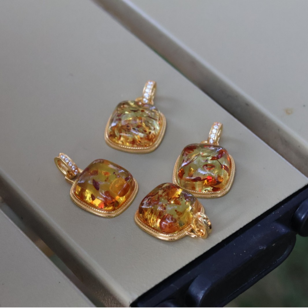 厂家批发 天然花珀方糖吊坠 S925银镶嵌