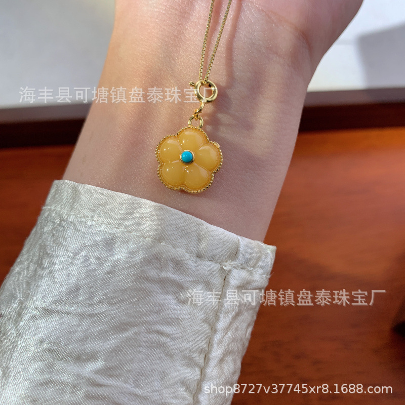 厂家批发 天然蜜蜡老蜡花花吊坠提溜款 S925银镶嵌