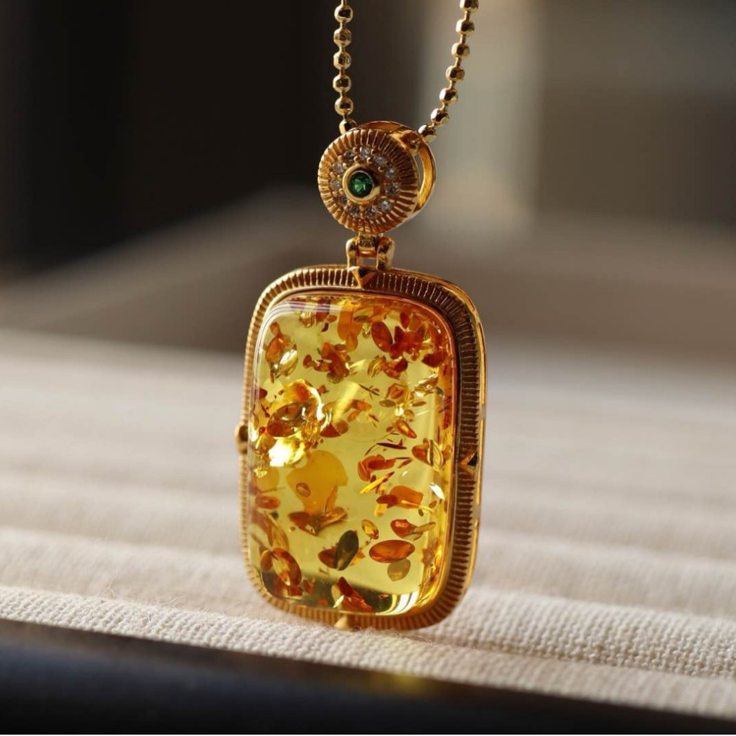 厂家批发 天然花珀琥珀方形无事牌吊坠 S925银镶嵌