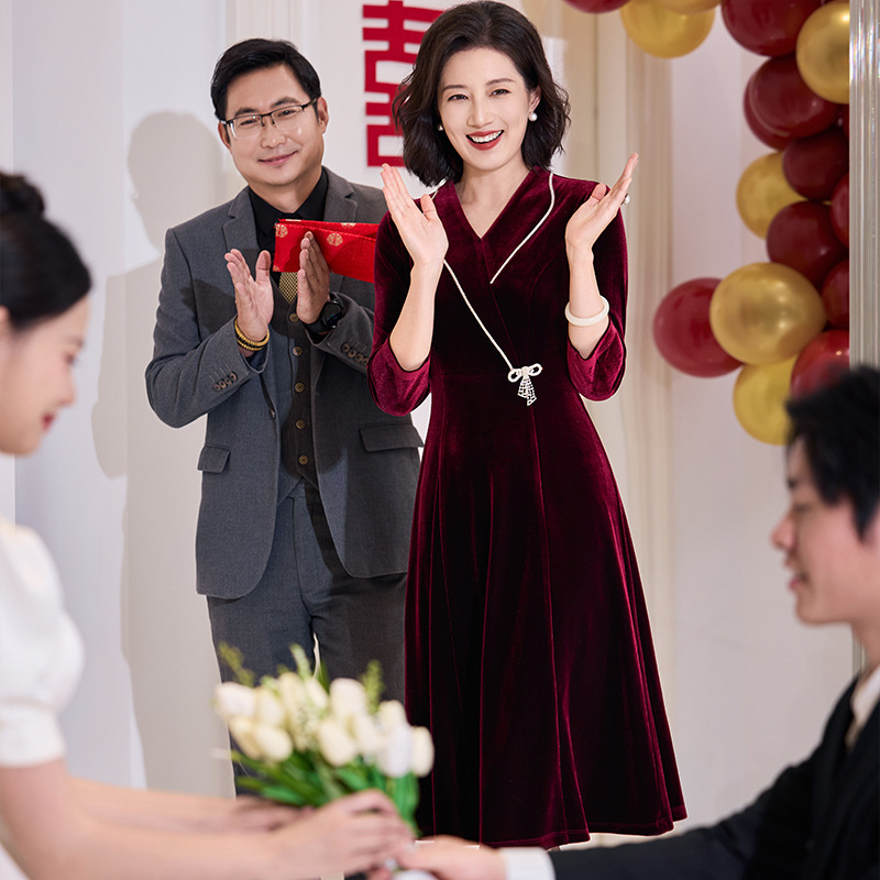 yqwl6619喜婆婆婚宴装红色礼服裙2025秋新款妈妈装气质优雅连衣裙
