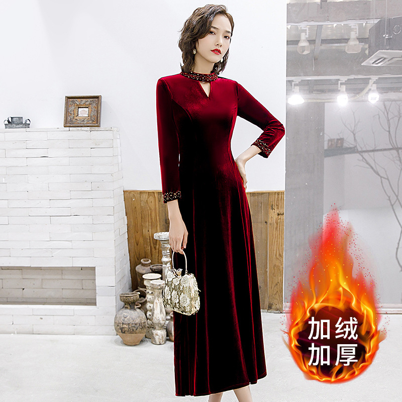 秋冬加绒新款韩版宴会名媛南韩金丝绒大码钉珠中年连衣裙礼服代发