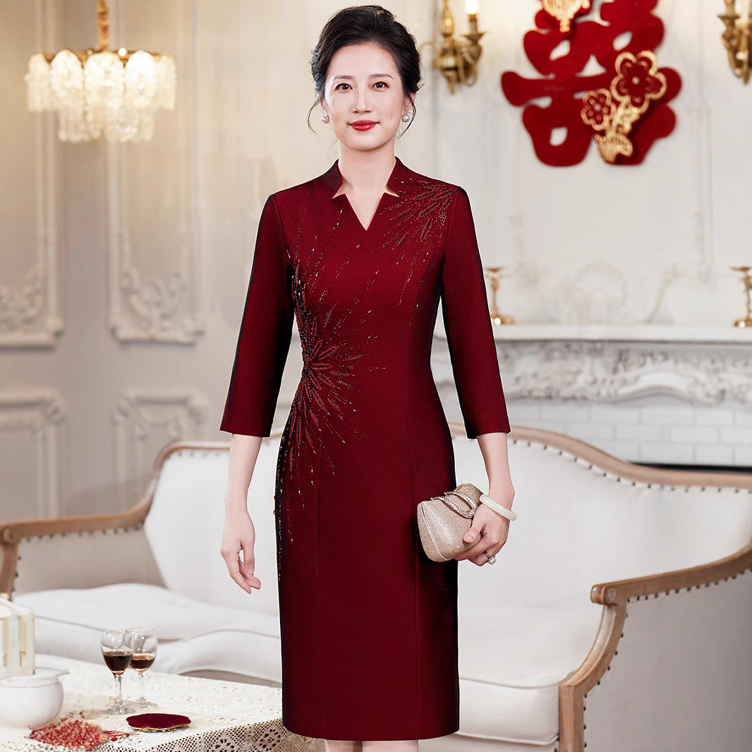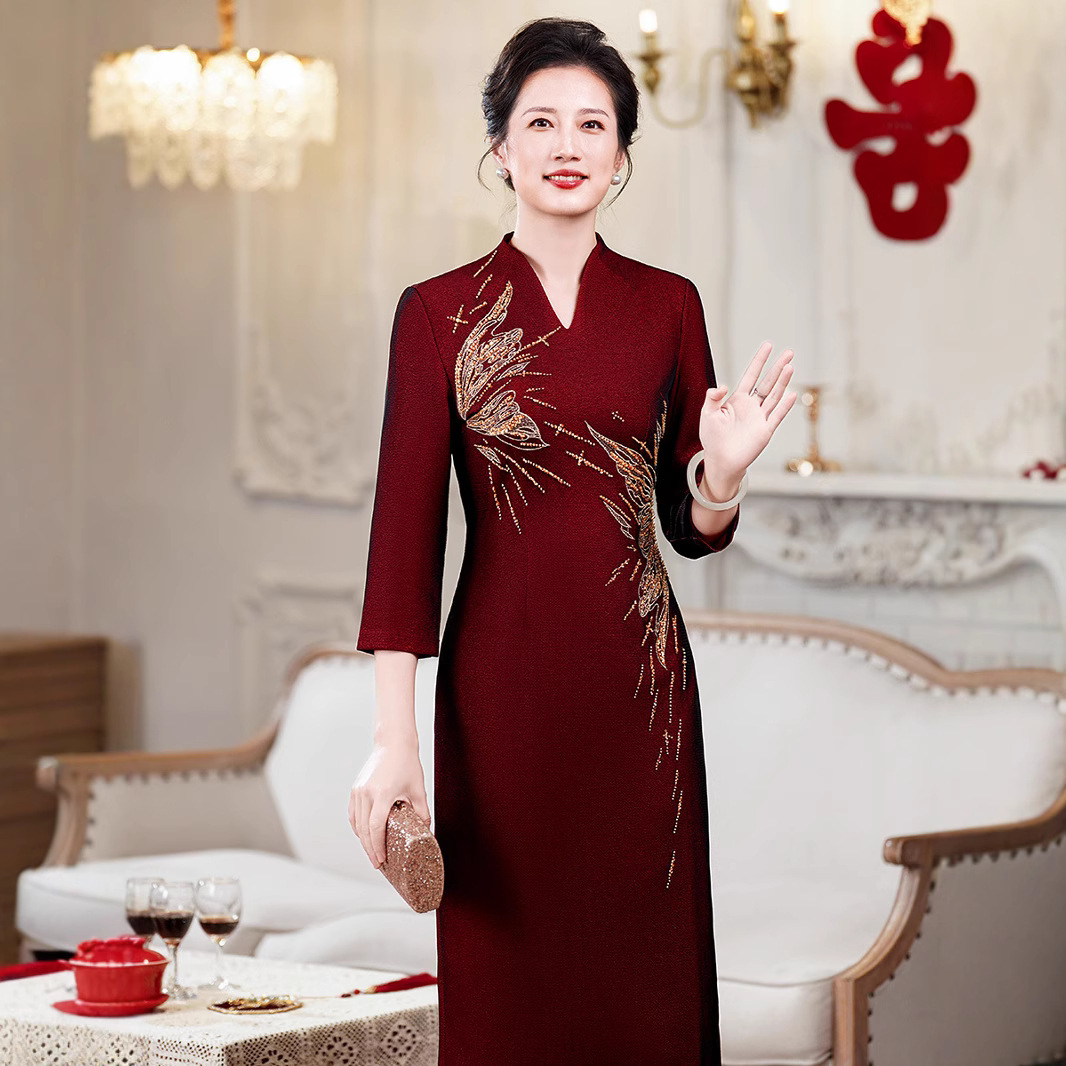 若い母親の中国風改良チャイナドレス女性のための春の新しいファッションビーズ結婚式の宴会ドレス乾杯ドレス