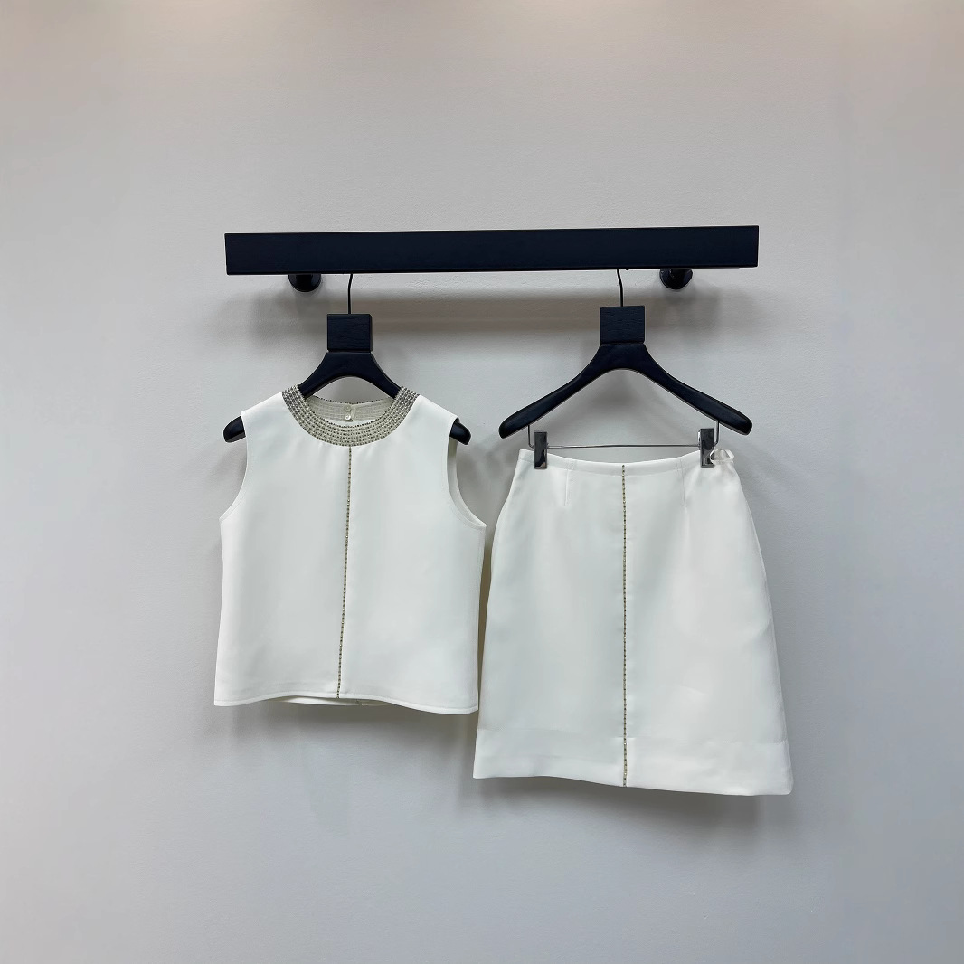 现货D家2025高定法式优雅名媛纯色圆领手工钉珠上衣高腰A字半身裙