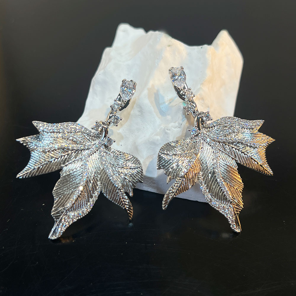 立体拉丝银杏叶甜酷风锆石明星同款欧美时尚夸张走秀款S925耳饰