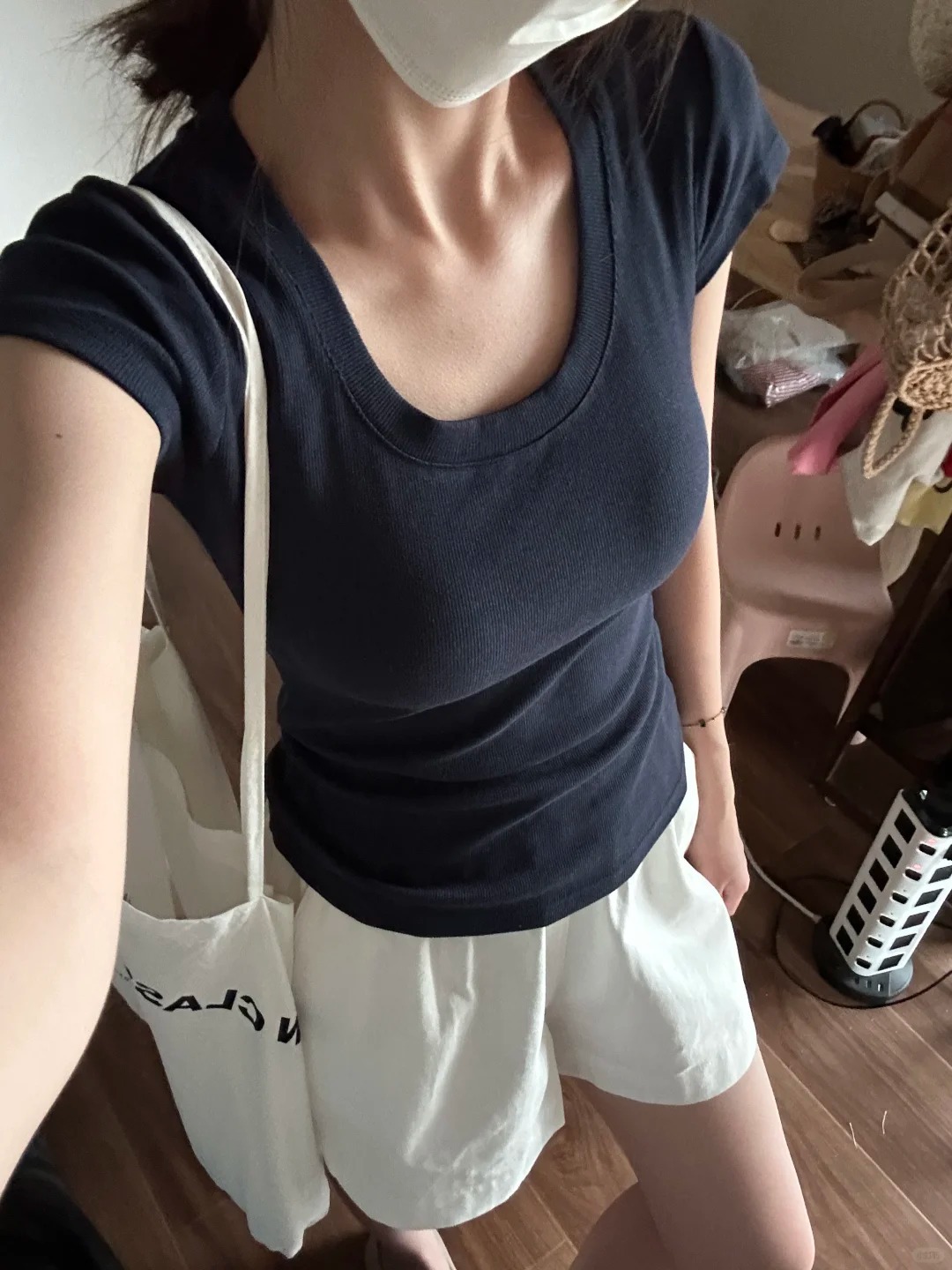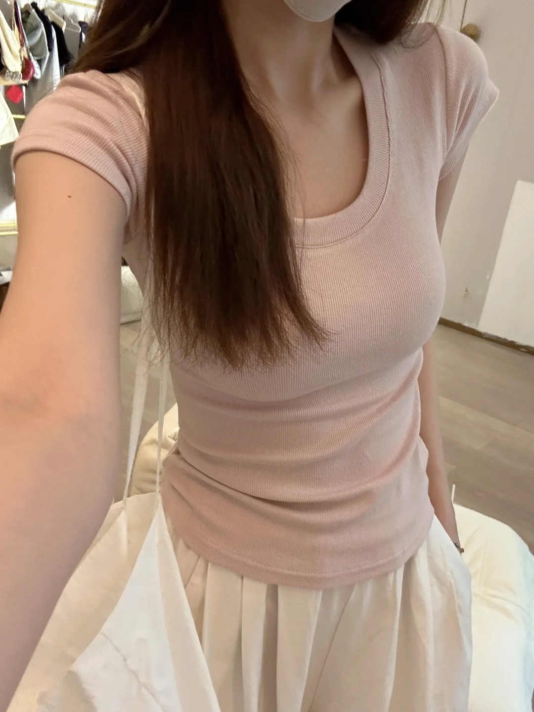 正肩u襟修身低襟白色半袖tシャツ女性夏2025内にシャツのガードルをかける