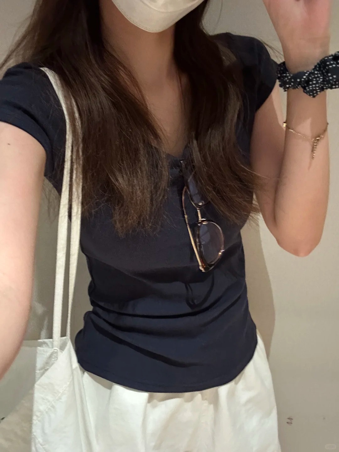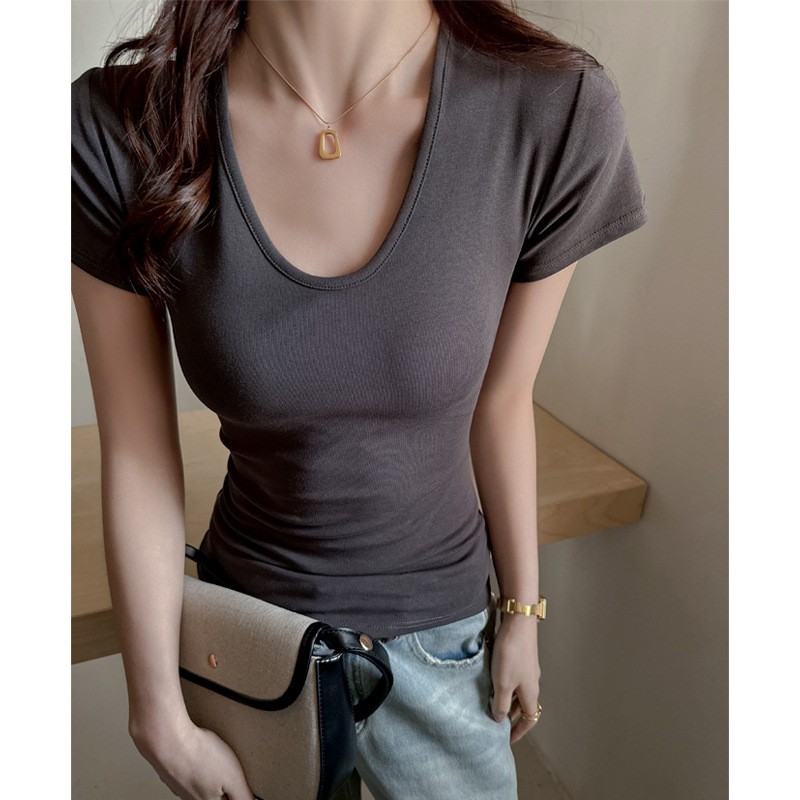 純欲風深U襟正肩半袖tシャツ女性式夏の修身はやせています。