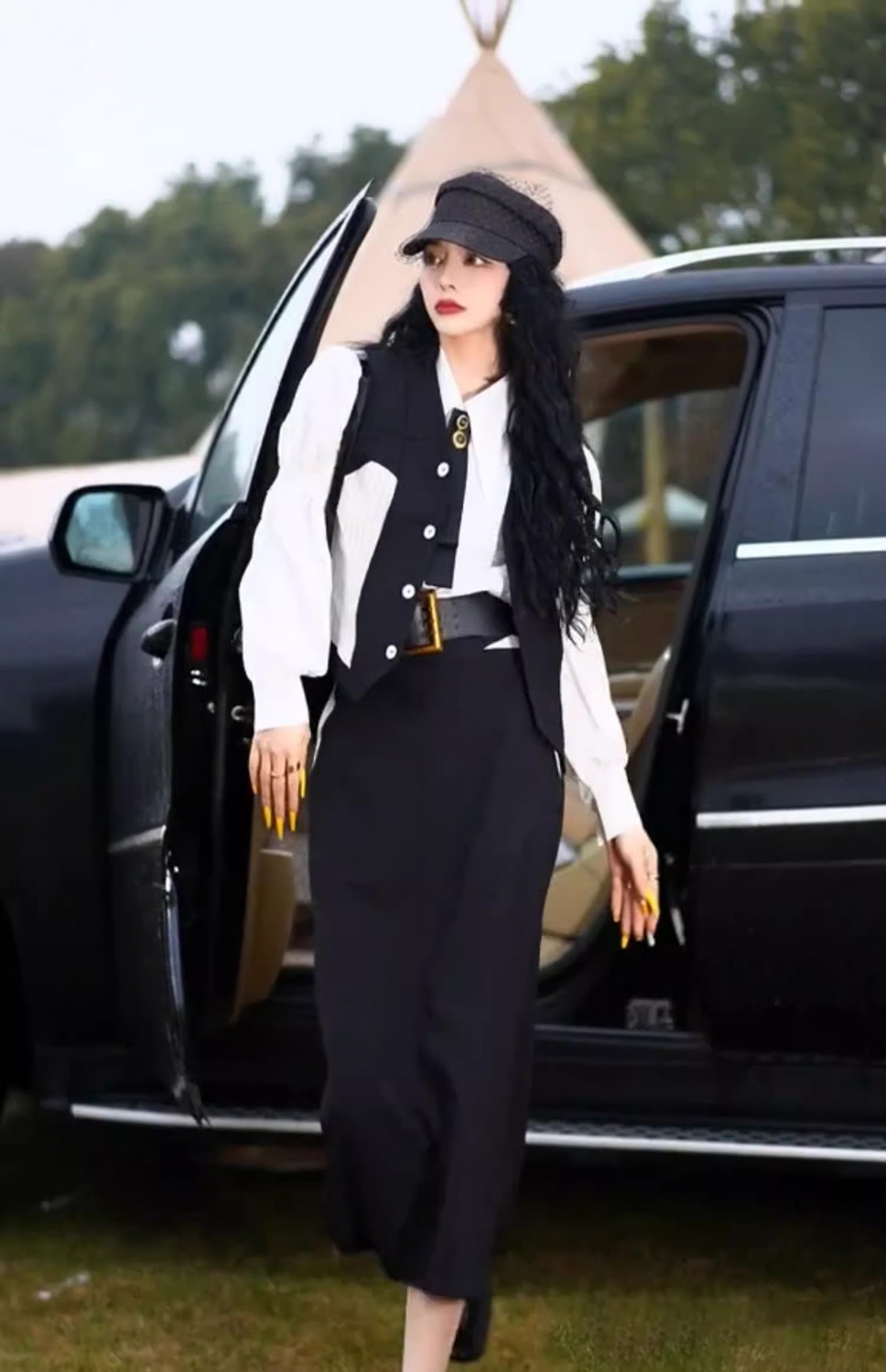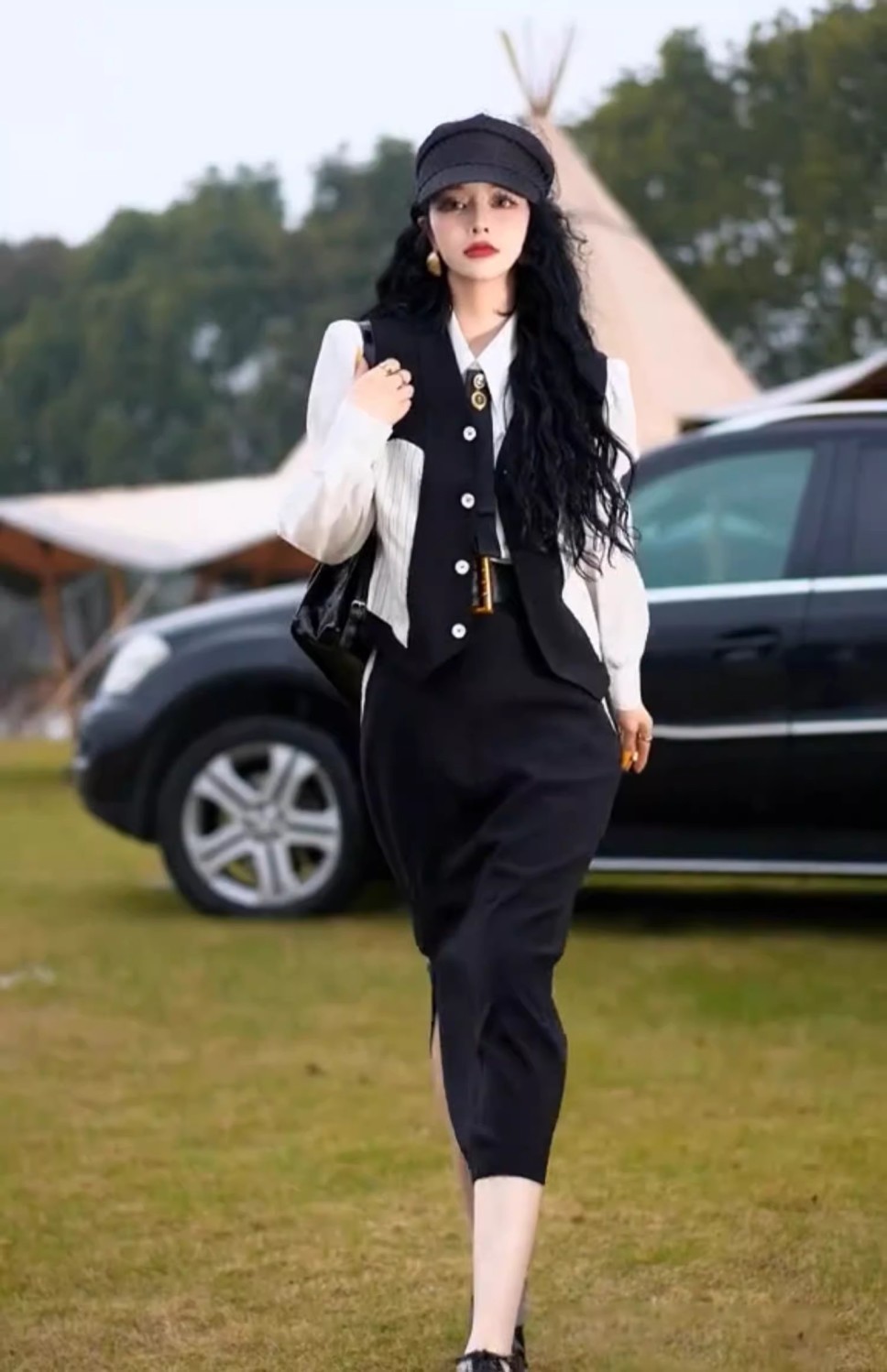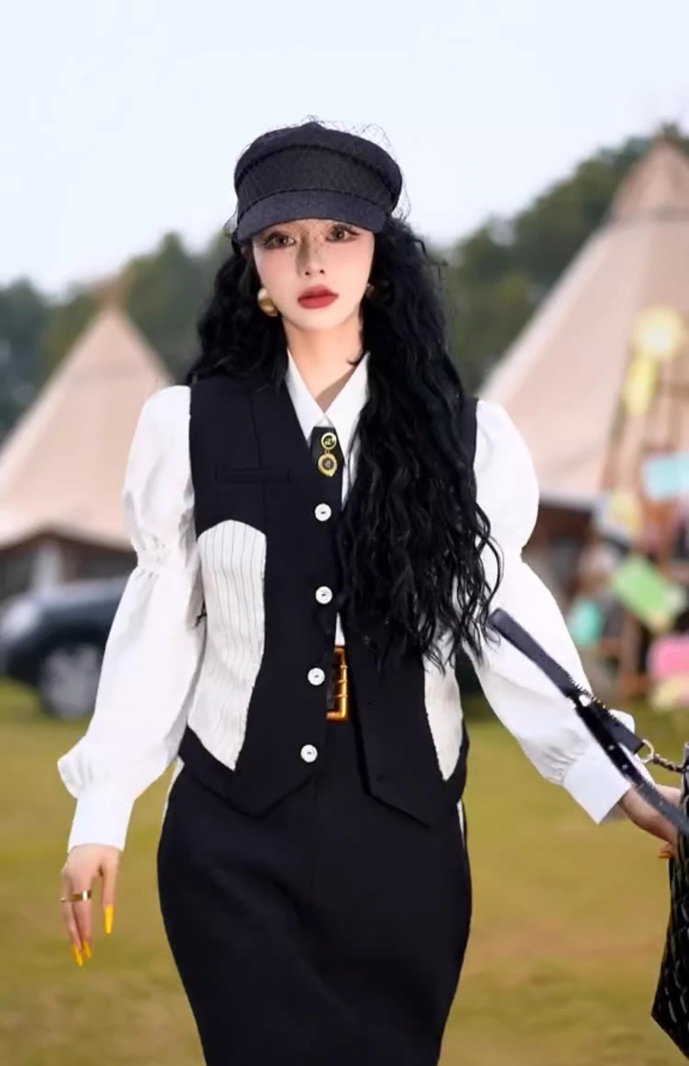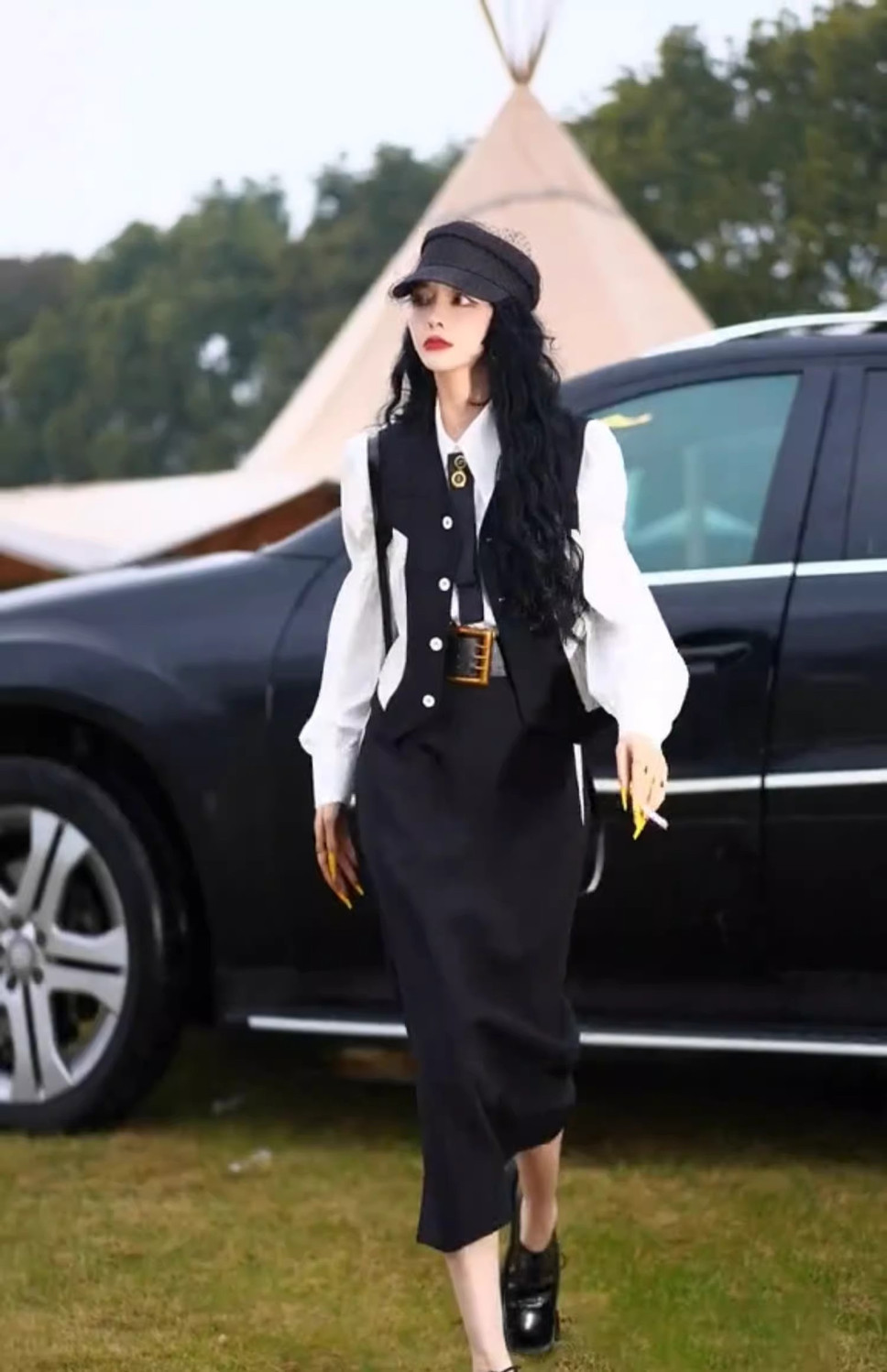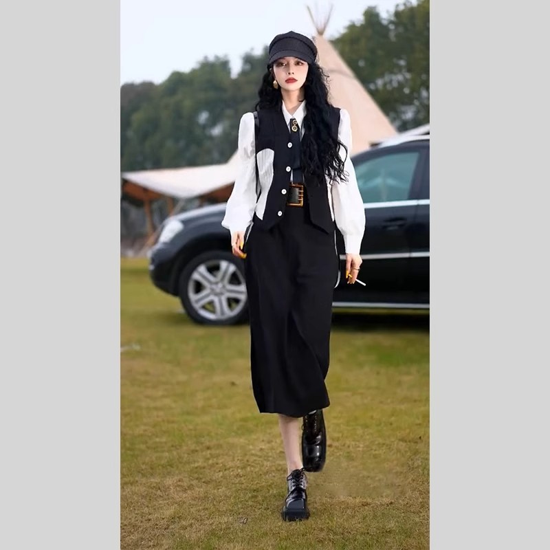 黒のベスト+シャツ+スカート,ベスト+シャツ+スカート+ベルト