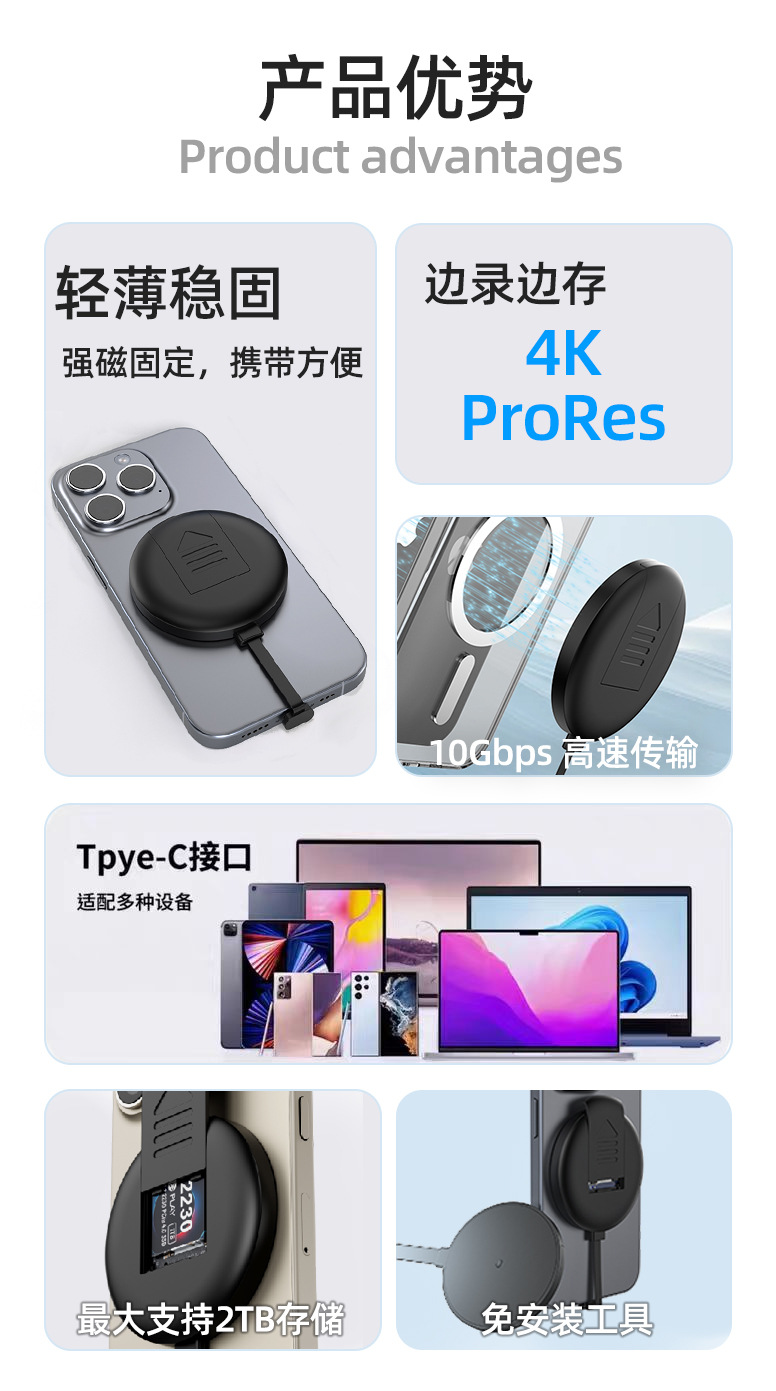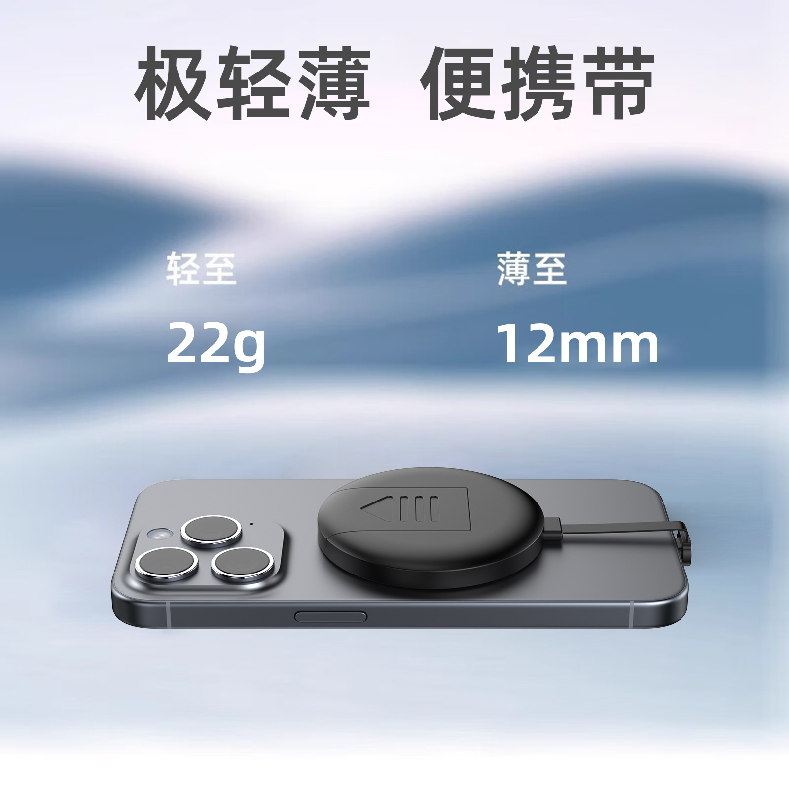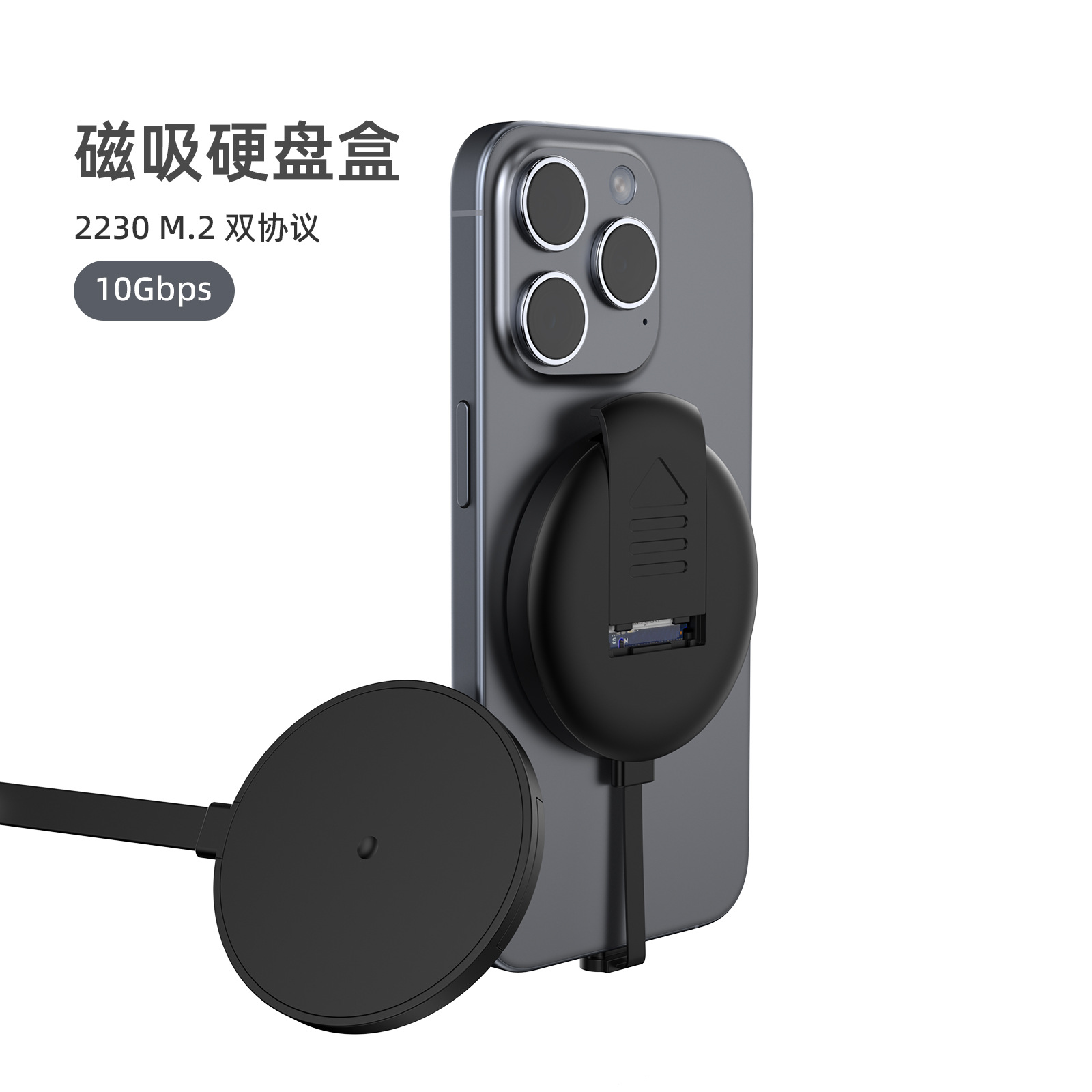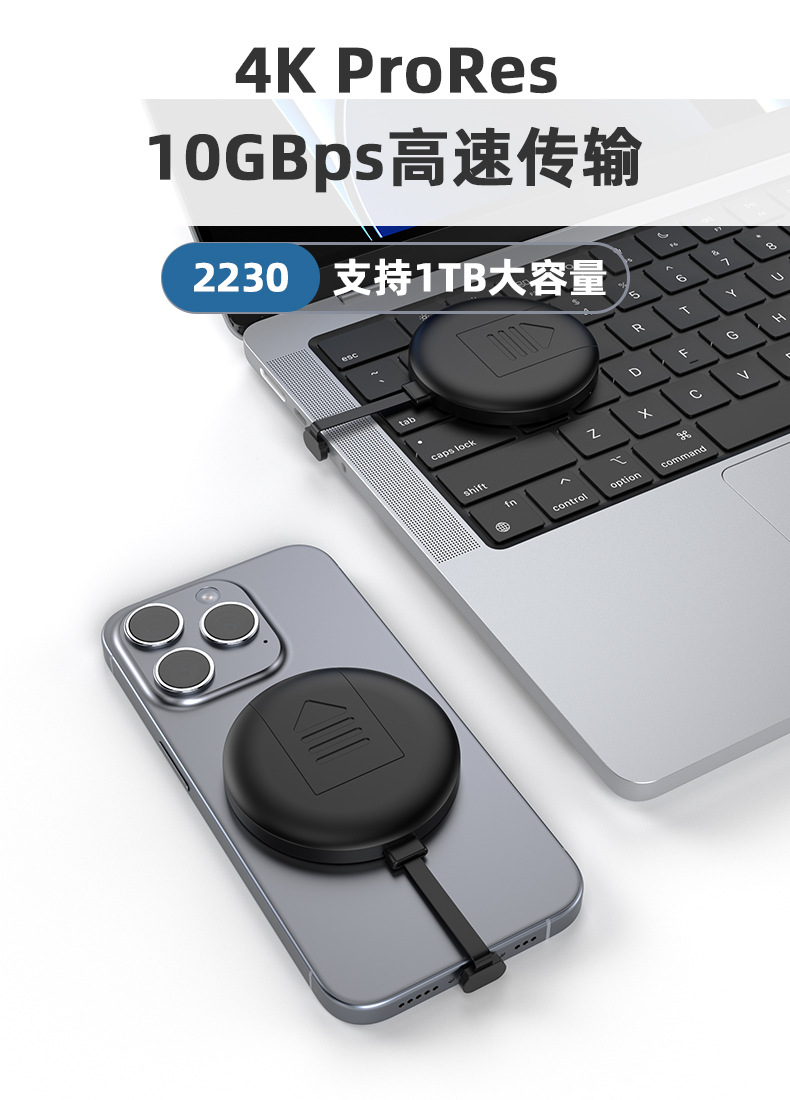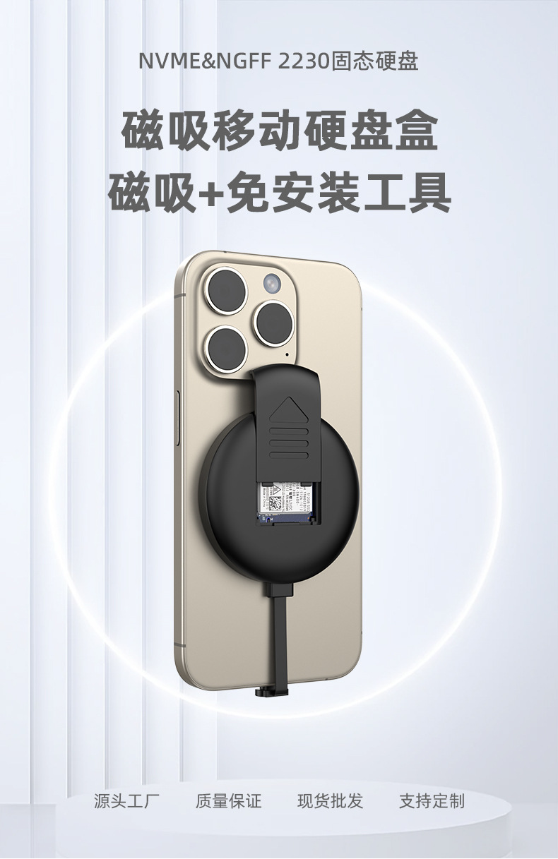 这款磁吸硬盘盒采用轻量化塑料外壳,重量极轻,便携无负担。专为Type-C接口设备(如iPhone 15 Pro、安卓手机、平板等)设计,轻松实现存储扩容。内置磁吸模块,兼容磁吸手机直接吸附使用;非磁吸设备可通过附赠铁圈快速适配,即贴即用。