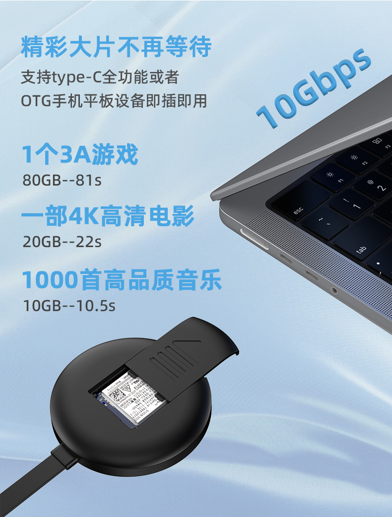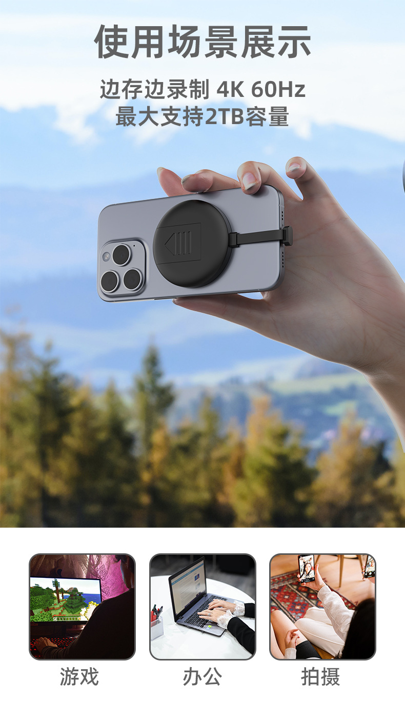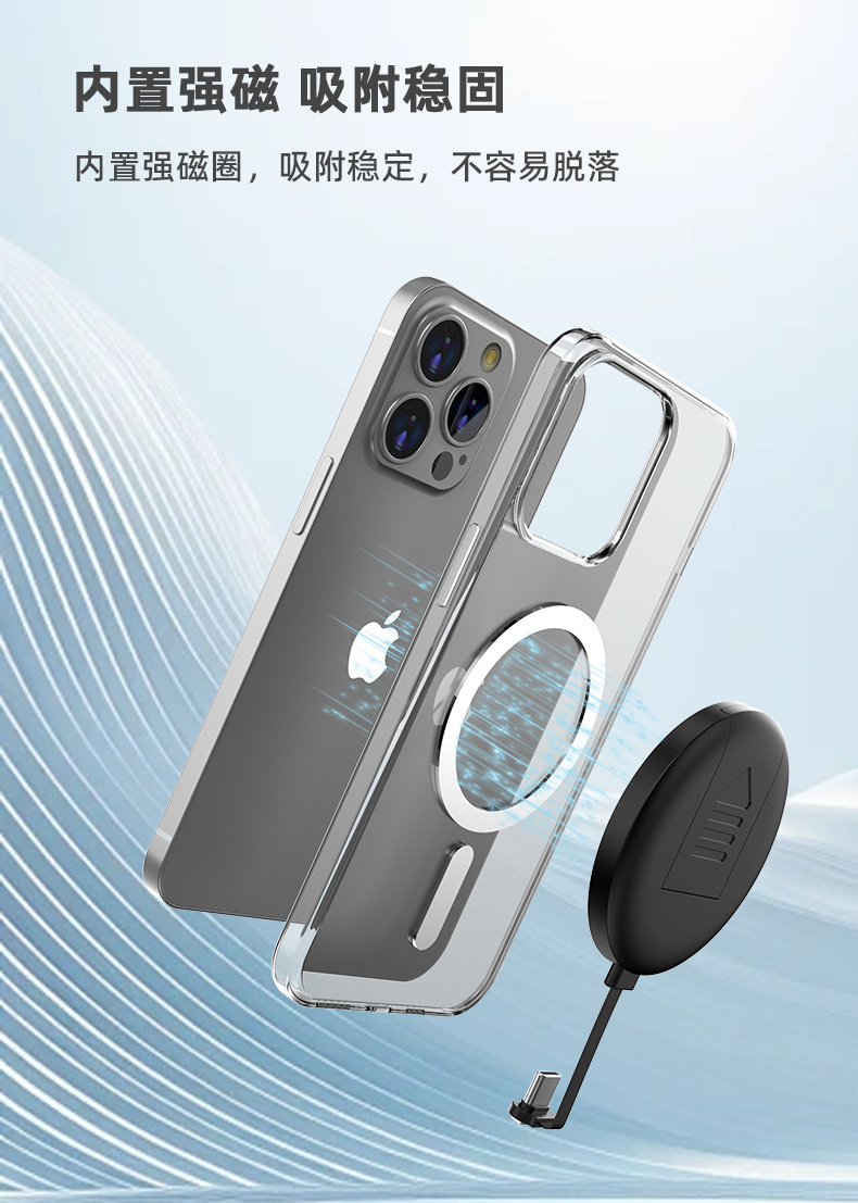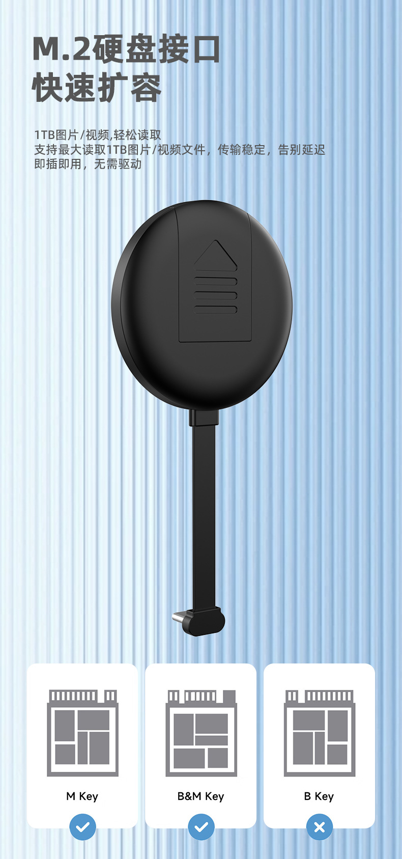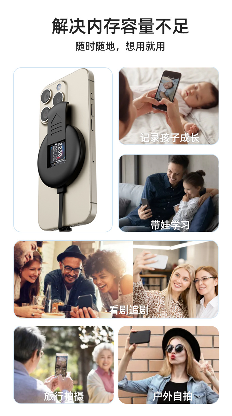 这款磁吸硬盘盒采用轻量化塑料外壳,重量极轻,便携无负担。专为Type-C接口设备(如iPhone 15 Pro、安卓手机、平板等)设计,轻松实现存储扩容。内置磁吸模块,兼容磁吸手机直接吸附使用;非磁吸设备可通过附赠铁圈快速适配,即贴即用。