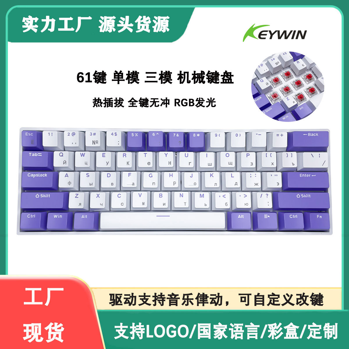 60% 配列ZK61機械キーボード61キーRGB発光三モードゲーム機械キーボード電気競争事務青軸