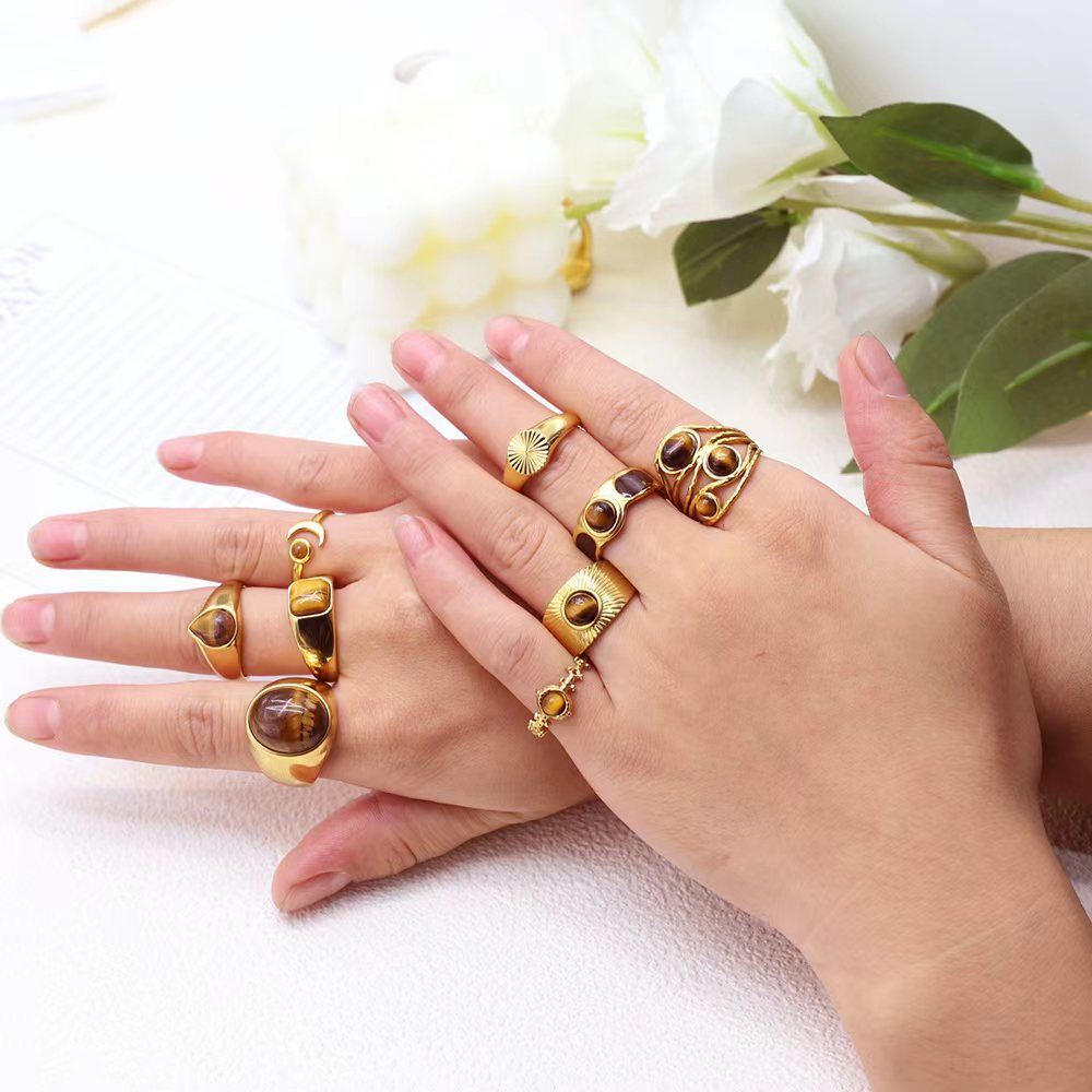 金色天然虎眼石开口戒指不锈钢不掉色闭口指环复古时尚女士饰品