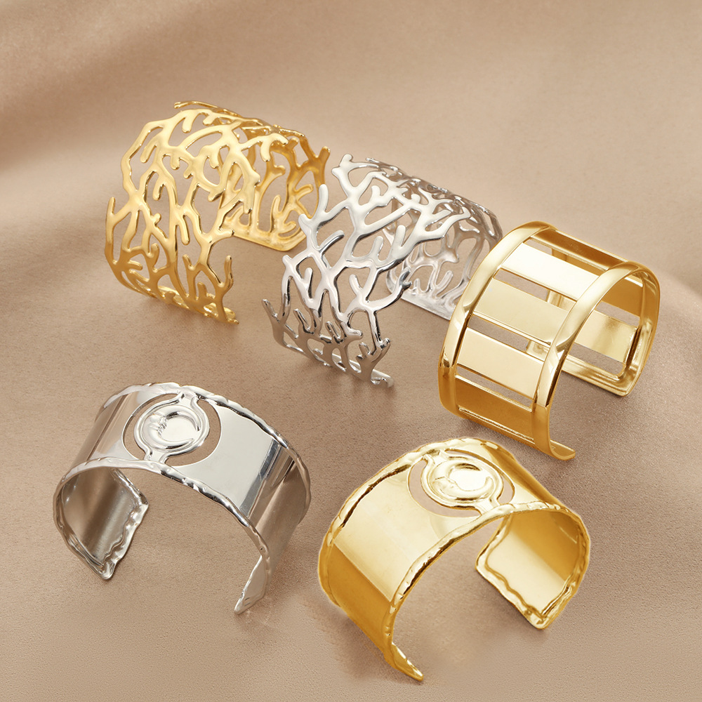 ヨーロッパとアメリカの幅広ステンレスブレスレット、誇張された開口部チタンブレスレット、中空デザイン、油圧ブレスレット、コーラルデザイン