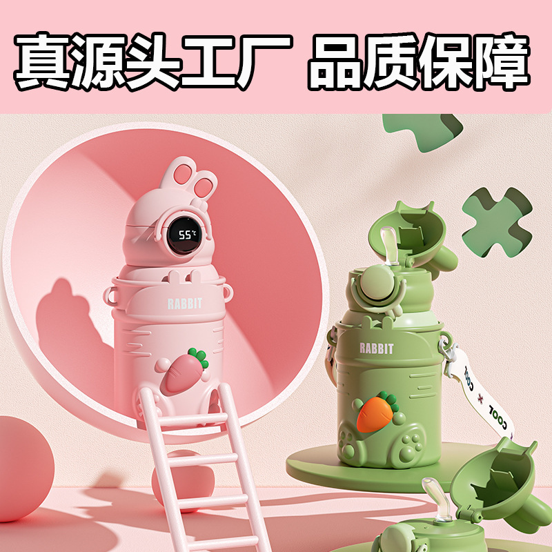 ウサギヨーヨー子供用カップ温度表示ジャンプ蓋ストロー魔法瓶カップ 316 ステンレス鋼子供用ストラップポータブル断熱