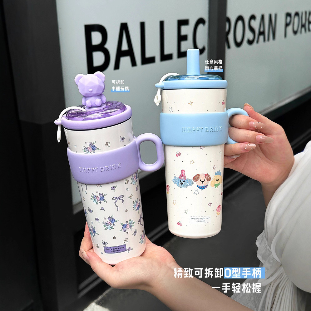 新しいins風保温カップ、女の子向け、高見えで可愛い水筒、学生向け、大容量、携帯用ストロー付きハンドル付きカップ