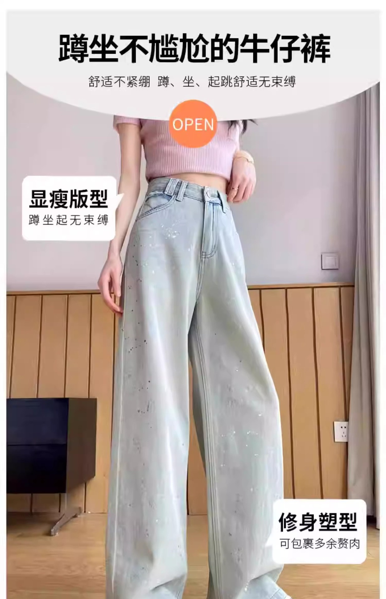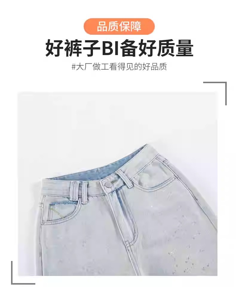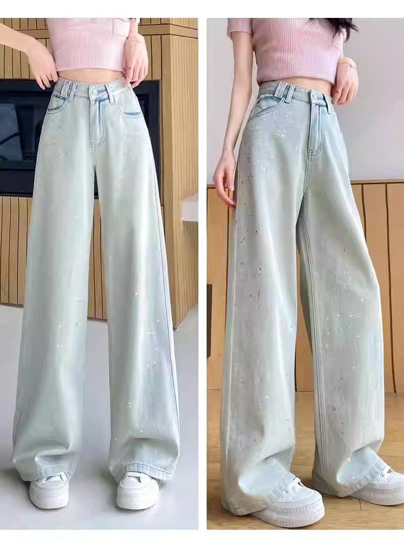 蓝色满天星重工烫钻爆闪阔腿牛仔裤女春季新款高腰宽松显瘦直筒裤