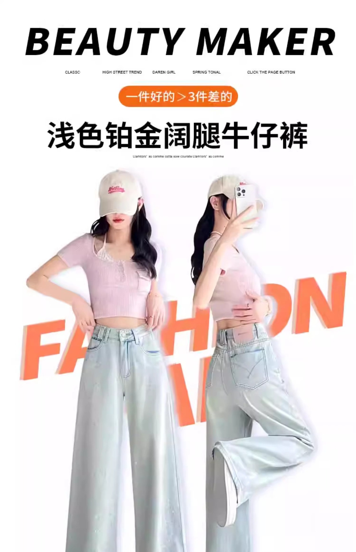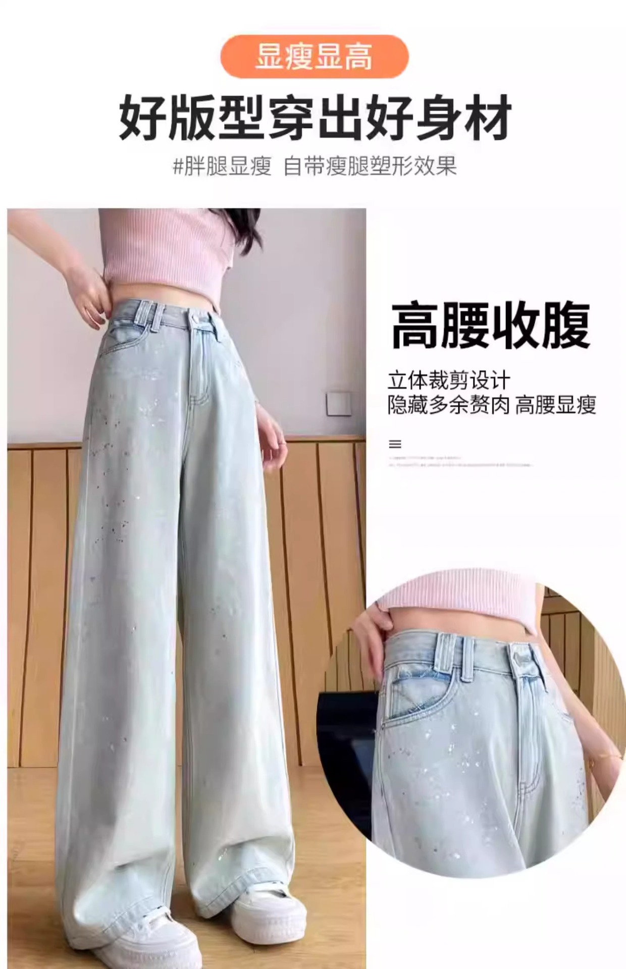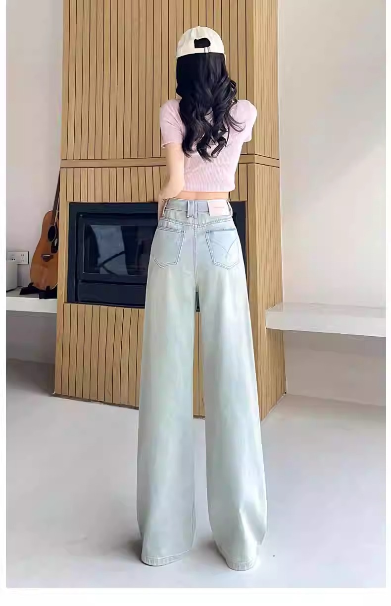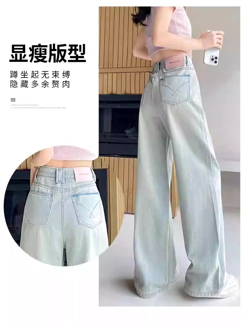 水色のレトロな重工業は金の広脚のジーパンの女性の2025春の新型の高腰のゆったりしている金のモップのズボンをかけます。